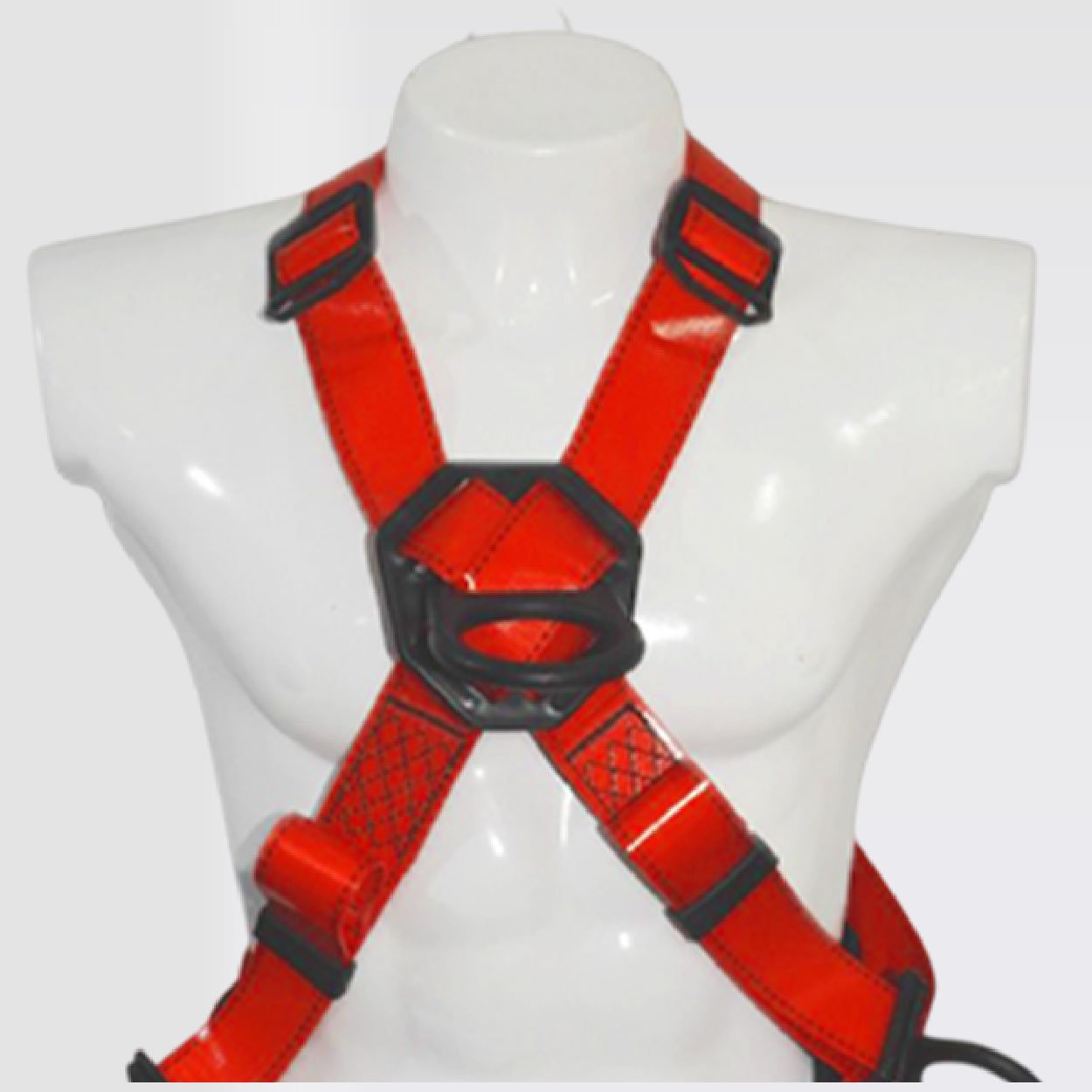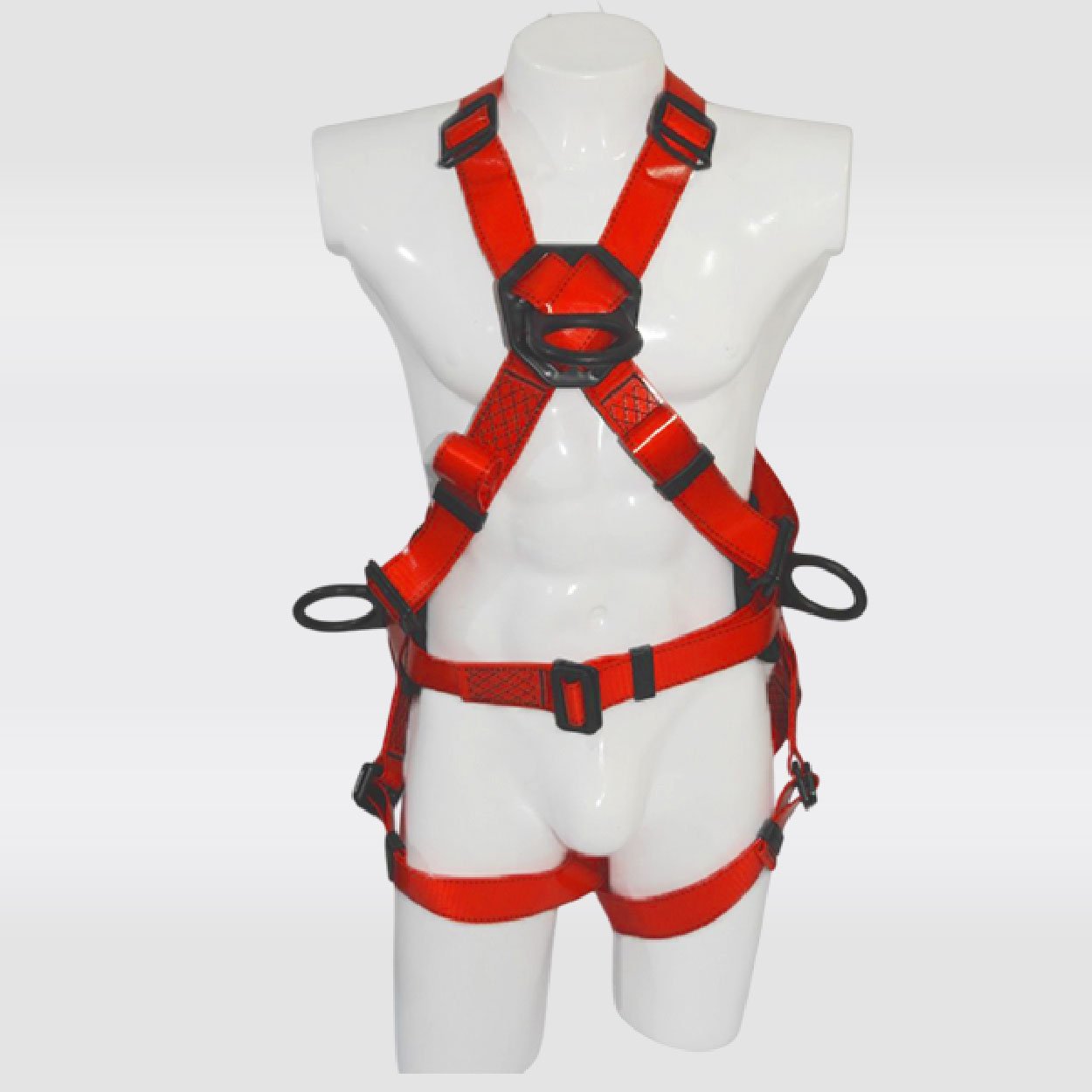 Arnés industrial de cuerpo completo, parte de un sistema Personal de detención de caídas, con diseño cruzado con faja para mayor confort, Certificado bajo la Norma ANSI/ASSP Z359.11:2021, Talla única, provisto de 4 argollas recubiertas en nylon con resistencia dieléctrica de 4Kv. equivalente a 4000V, reata con capa en poliuretano de color rojo, resistencia de 5000 libras O 22,2Kn, 5MBS.