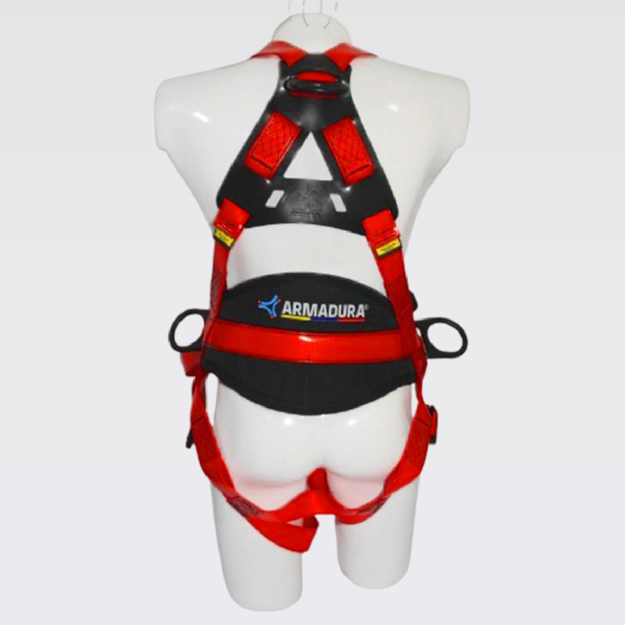 Arnés diseño x con reata recubierta en poliuretano, 4 argollas anticorrosivo, con soporte lumbar.