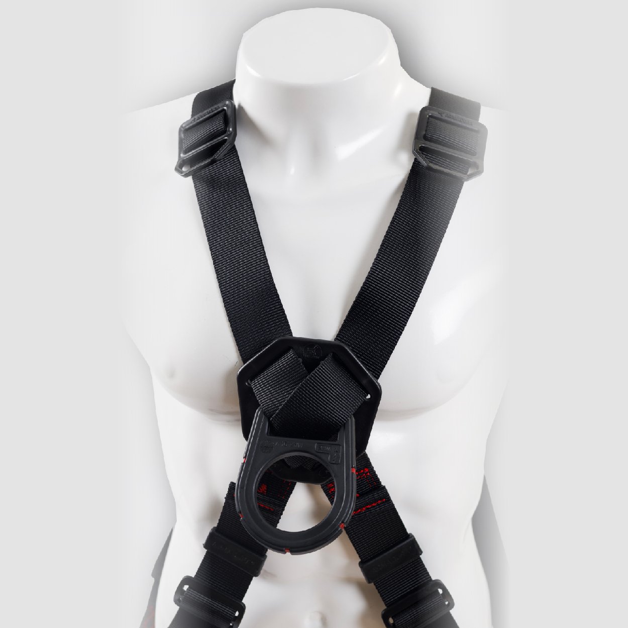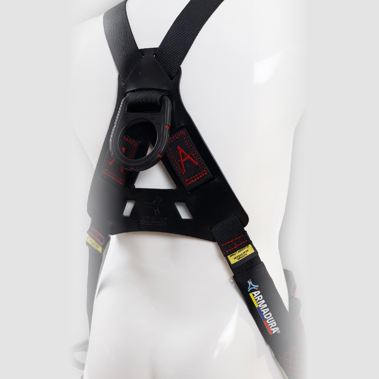 Arnés industrial de cuerpo completo, parte de un sistema Personal de detención de caídas, con diseño cruzado, certificado bajo la Norma ANSI/ASSE Z359.11:2021, Talla única, provisto de 4 argollas en acero recubiertas en nylon con resistencia dieléctrica de 9Kv. equivalente a 9000V, reata negra.