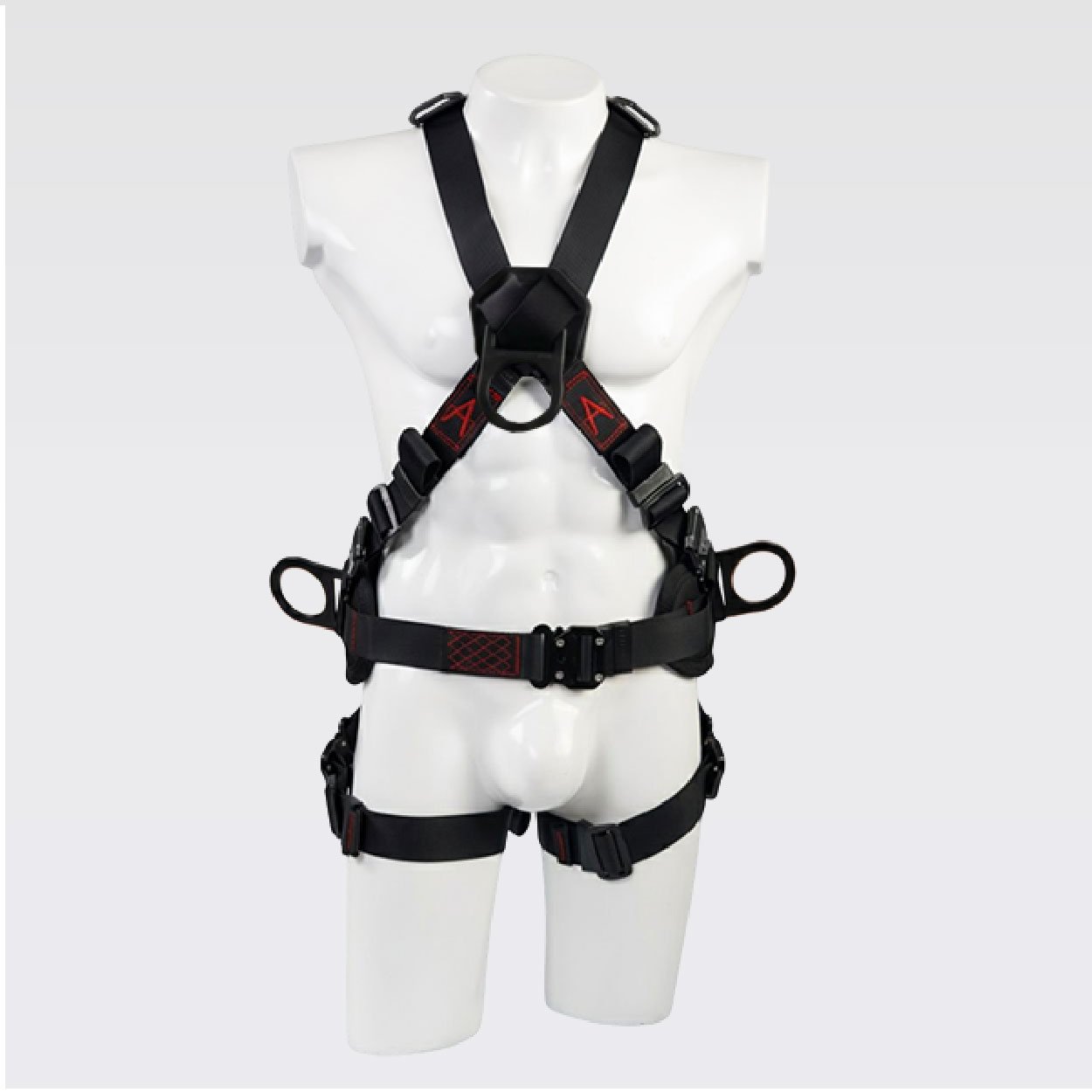 Arnés industrial de cuerpo completo, parte de un sistema Personal de detención de caídas, con diseño cruzado, Certificado bajo la Norma ANSI/ASSP Z359.11:2021, Talla única, con soporte lumbar para mayor confort, provisto de hebillas de ajuste rápido y 4 argollas en acero recubiertas en nylon con resistencia dieléctrica de 4Kv. equivalente a 4000V, reata negra, resistencia de 5000 libras o 22,2Kn, 5MBS.