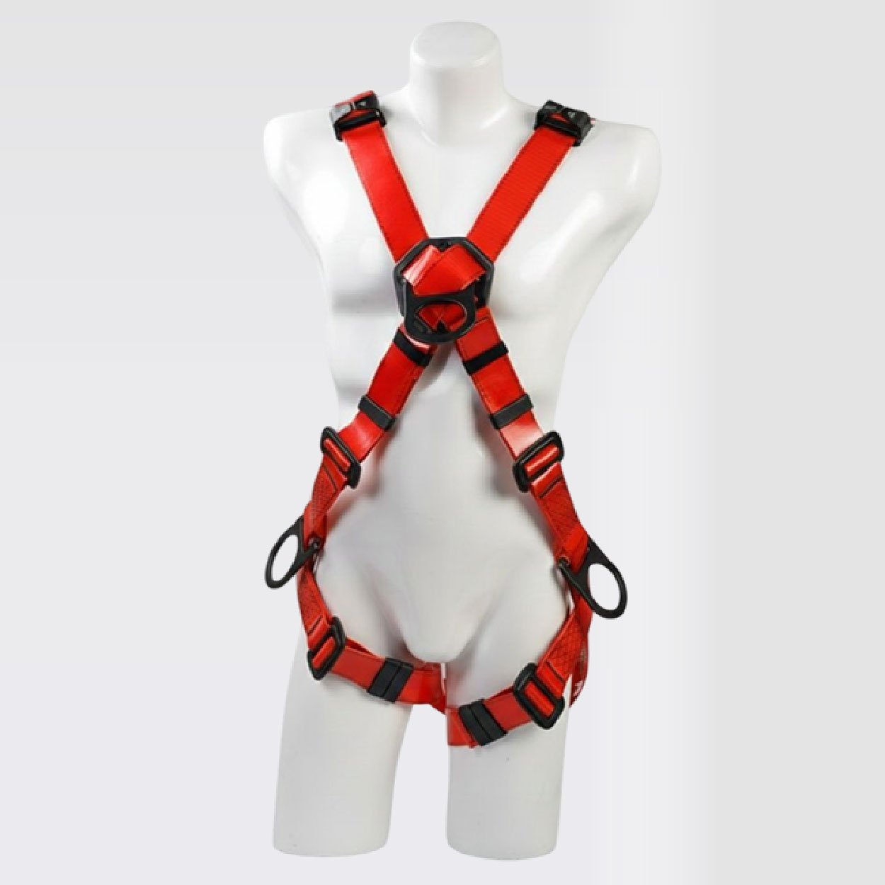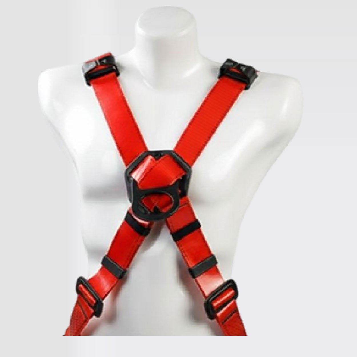 Arnés industrial de cuerpo completo, parte de un sistema Personal de detención de caídas, con diseño cruzado, Certificado bajo la Norma ANSI/ASSP Z359.11:2021, Talla única, provisto de 4 argollas recubiertas en nylon con resistencia dieléctrica de 4Kv. equivalente a 4000V, reata con capa en poliuretano de color rojo, resistencia de 5000 libras O 22.2Kn, 5MBS.