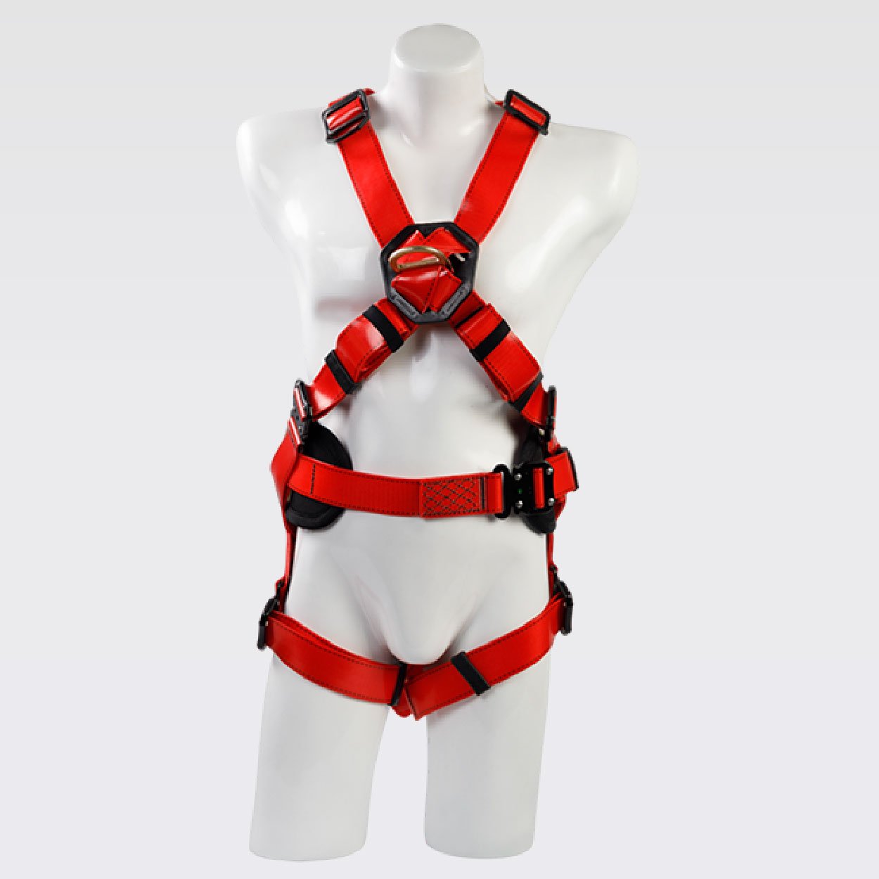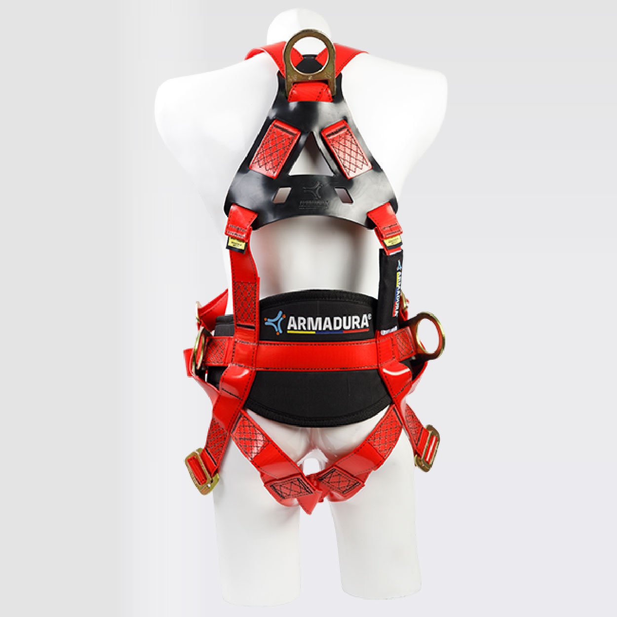 Arnés industrial de cuerpo completo, parte de un sistema Personal de detención de caídas, con diseño cruzado, Certificado bajo la Norma ANSI/ASSP Z359.11:2021, Talla única, con soporte lumbar para mayor confort, provisto de hebillas de ajuste rápido y 4 argollas en acero con recubrimiento anodizado en el herraje, reata negra, resistencia de 5000 libras o 22,2Kn, 5MBS.