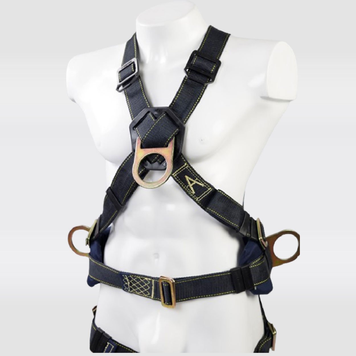 Arnés industrial de cuerpo completo, parte de un sistema Personal de detención de caídas, con diseño cruzado, Certificado bajo la Norma ANSI/ASSP Z359.11:2021, Talla única, con soporte lumbar para mayor confort, provisto de 4 argollas en acero con recubrimiento anodizado en el herraje, reata ignifuga para protección al calor y las llamas. Cumpliendo con los lineamientos de la ASTM F887:23 (40 Cal/Cm2)*. resistencia de 5000 libras o 22.2Kn, 5MBS.