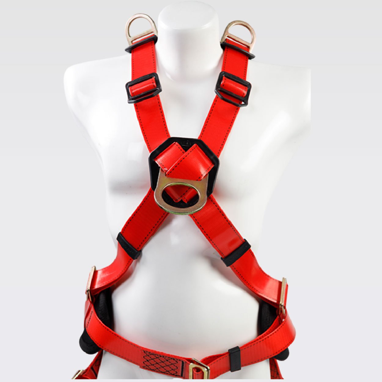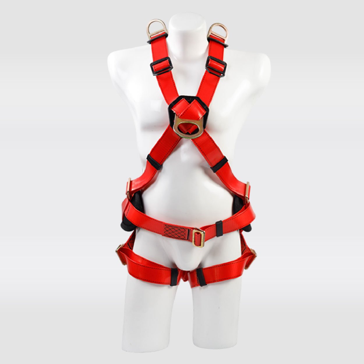 Arnés industrial de cuerpo completo, parte de un sistema Personal de detención de caídas, con diseño cruzado, certificado bajo la Norma ANSI/ASSP Z359.11:2021, Talla única, con soporte lumbar para mayor confort, provisto de 6 argollas recubrimiento anodizado en el herraje, reata con capa en poliuretano de color rojo, resistencia de 5000 libras o 22,2Kn, 5MBS.