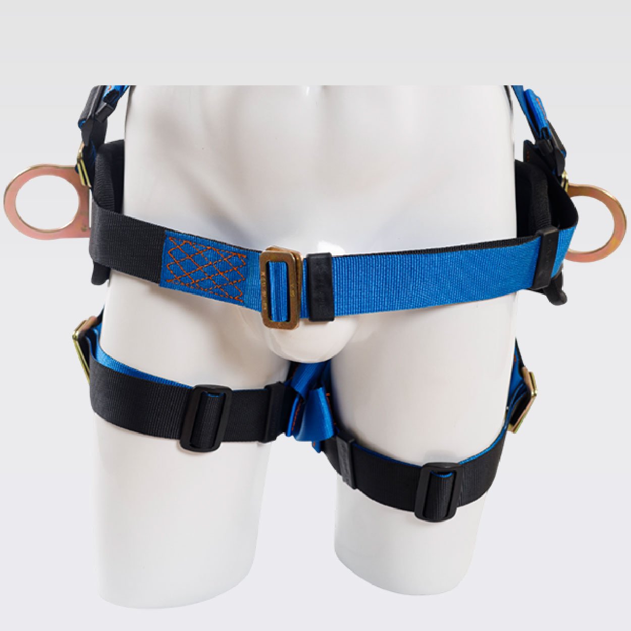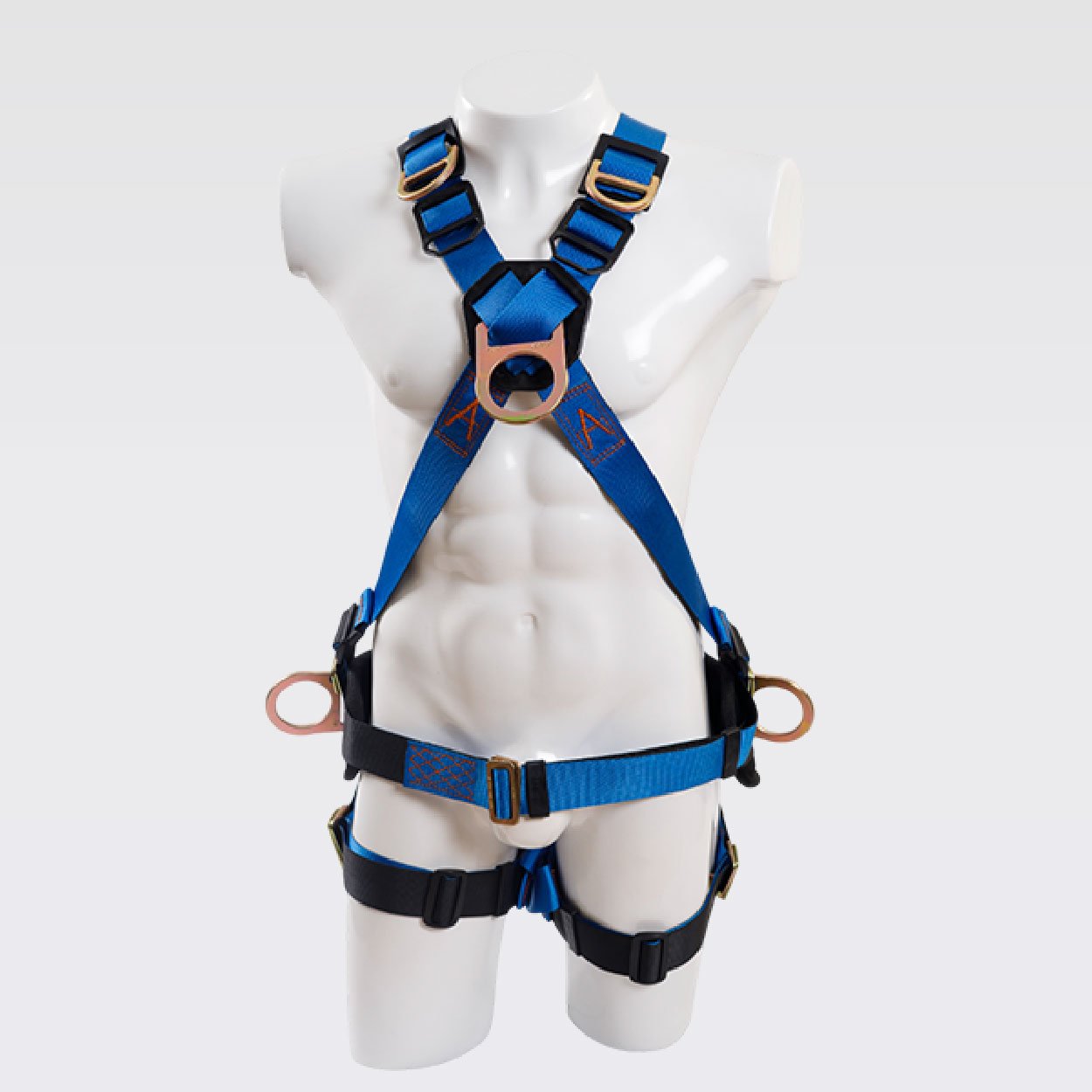 Arnés industrial de cuerpo completo, parte de un sistema Personal de detención de caídas, con diseño cruzado, certificado bajo la Norma ANSI/ASSP Z359.11:2021, Talla única, con soporte lumbar para mayor confort, provisto de 6 argollas, recubrimiento anodizado en el herraje, reata bicolor (azul-negro), resistencia de 5000 libras o 22.2Kn, 5MBS.