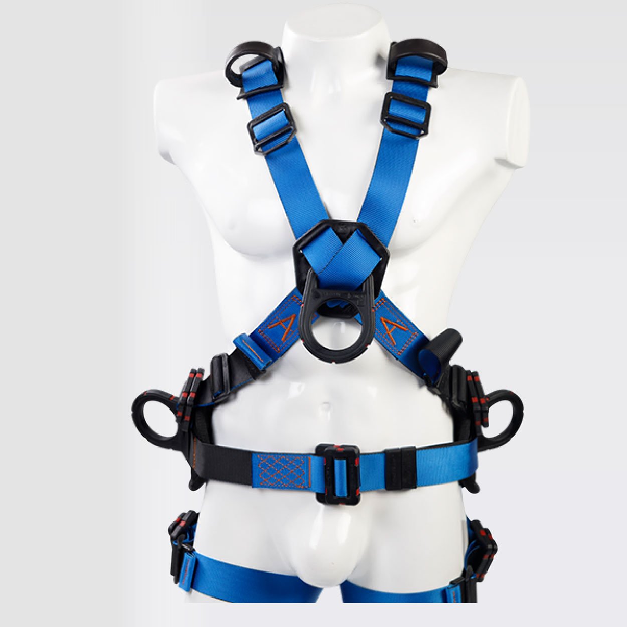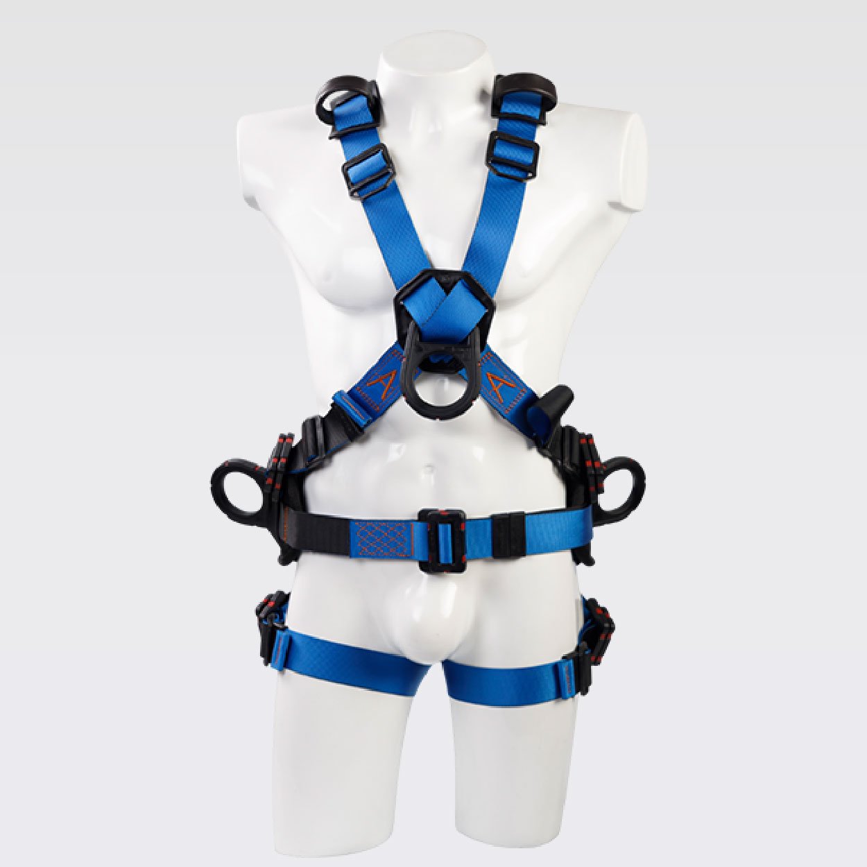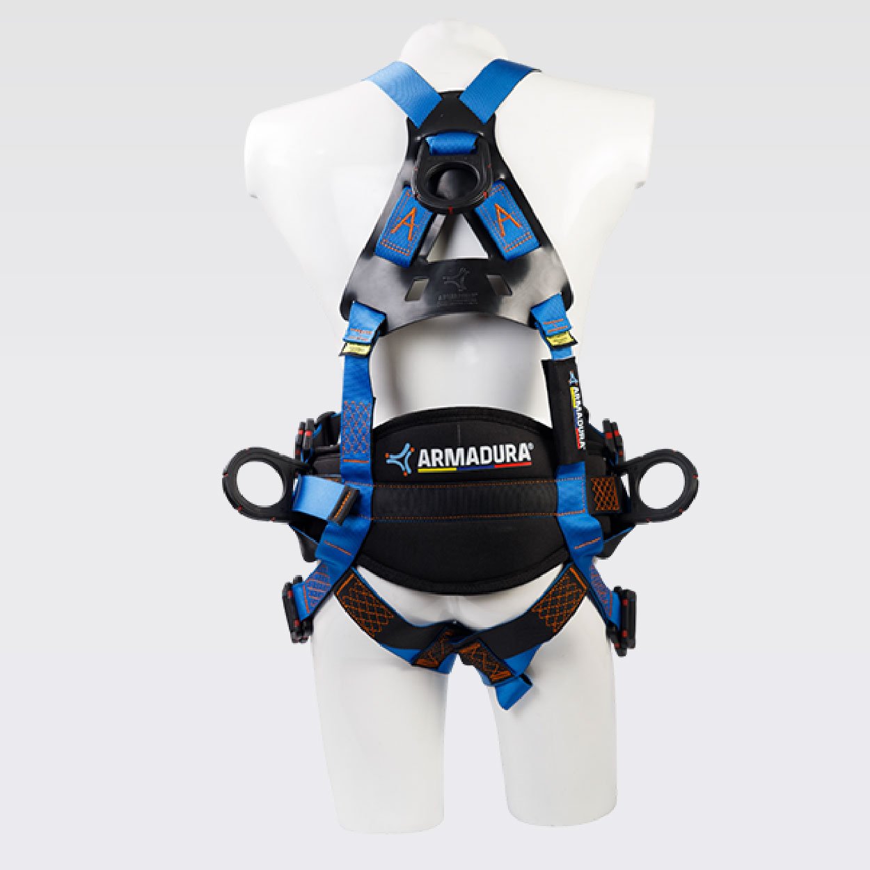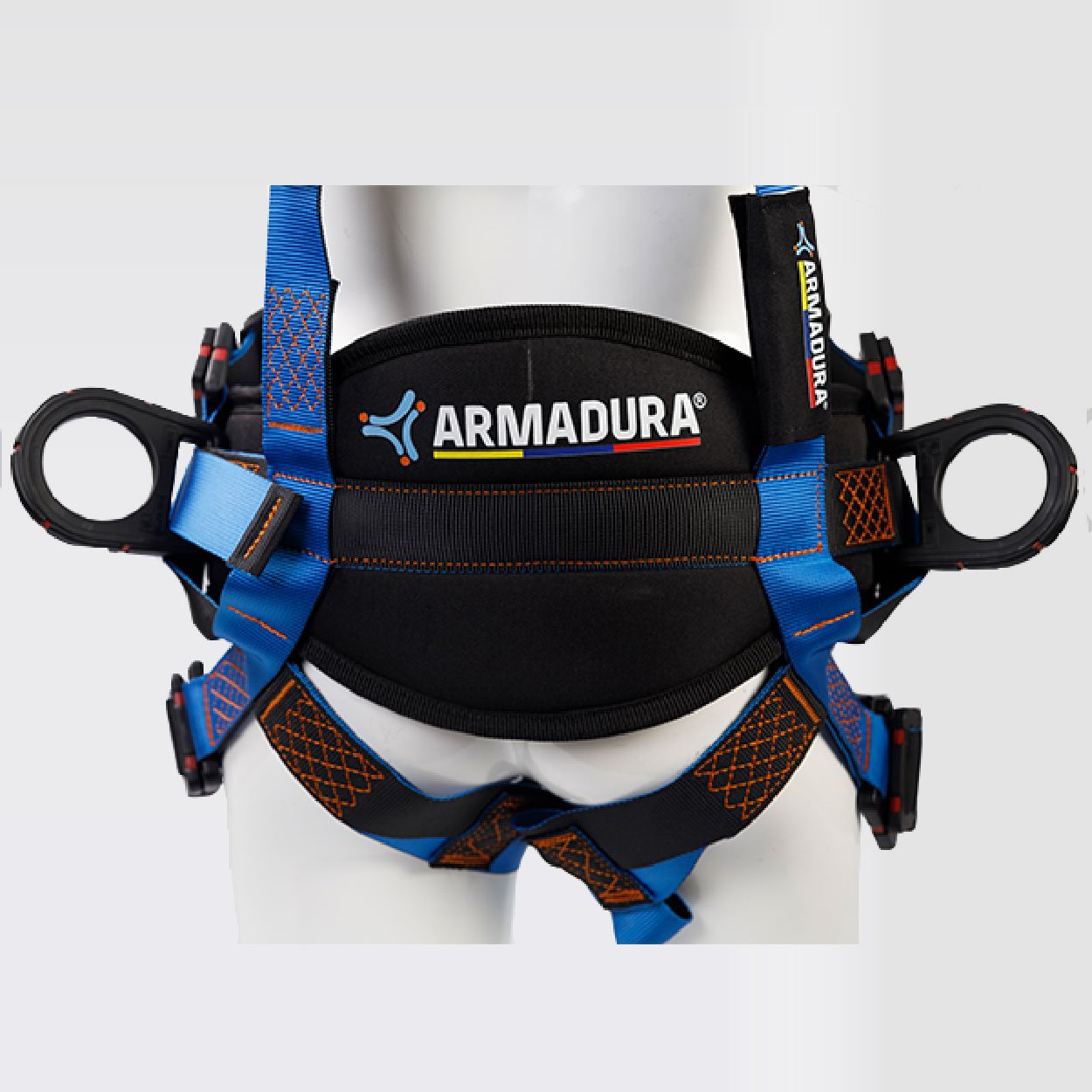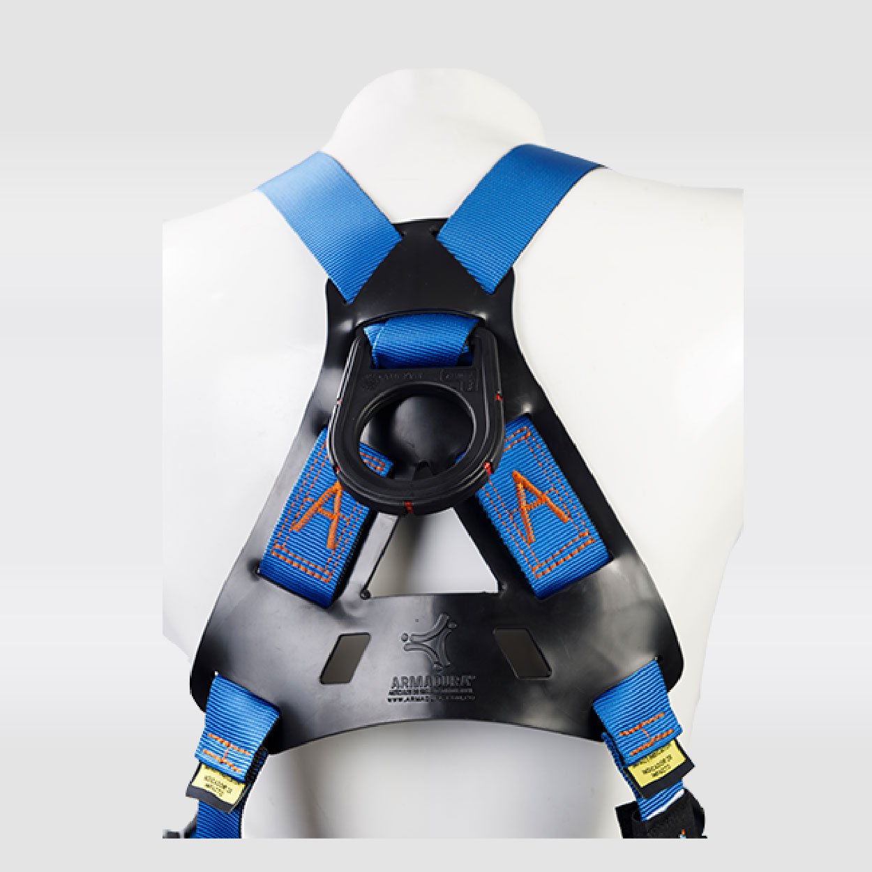 Arnés industrial de cuerpo completo, parte de un sistema Personal de detención de caídas, con diseño cruzado, certificado bajo la Norma ANSI/ASSP Z359.11:2021, Talla única, con soporte lumbar para mayor confort, provisto de 2 argollas en reata y 4 argollas en acero recubiertas en nylon con resistencia dieléctrica de 9Kv. equivalente