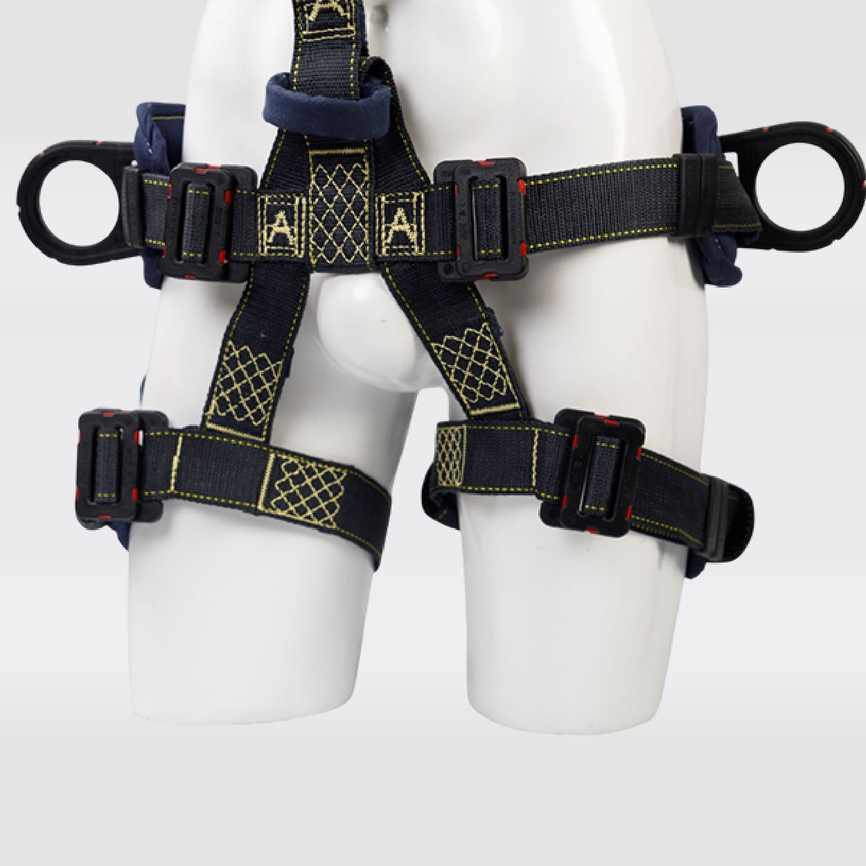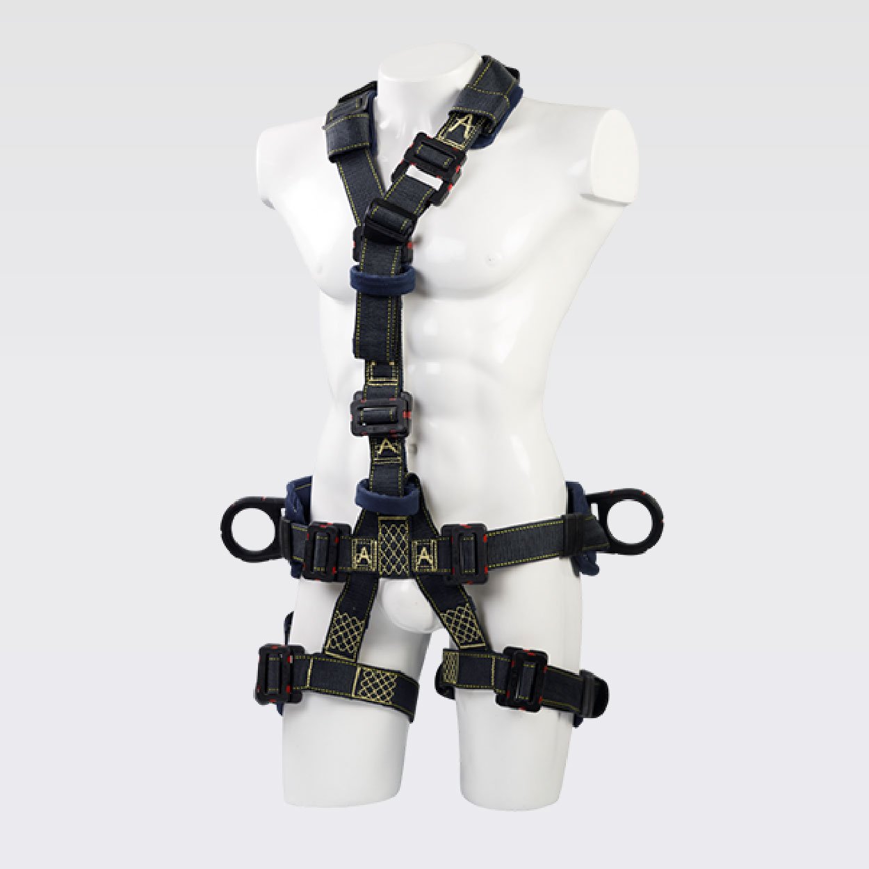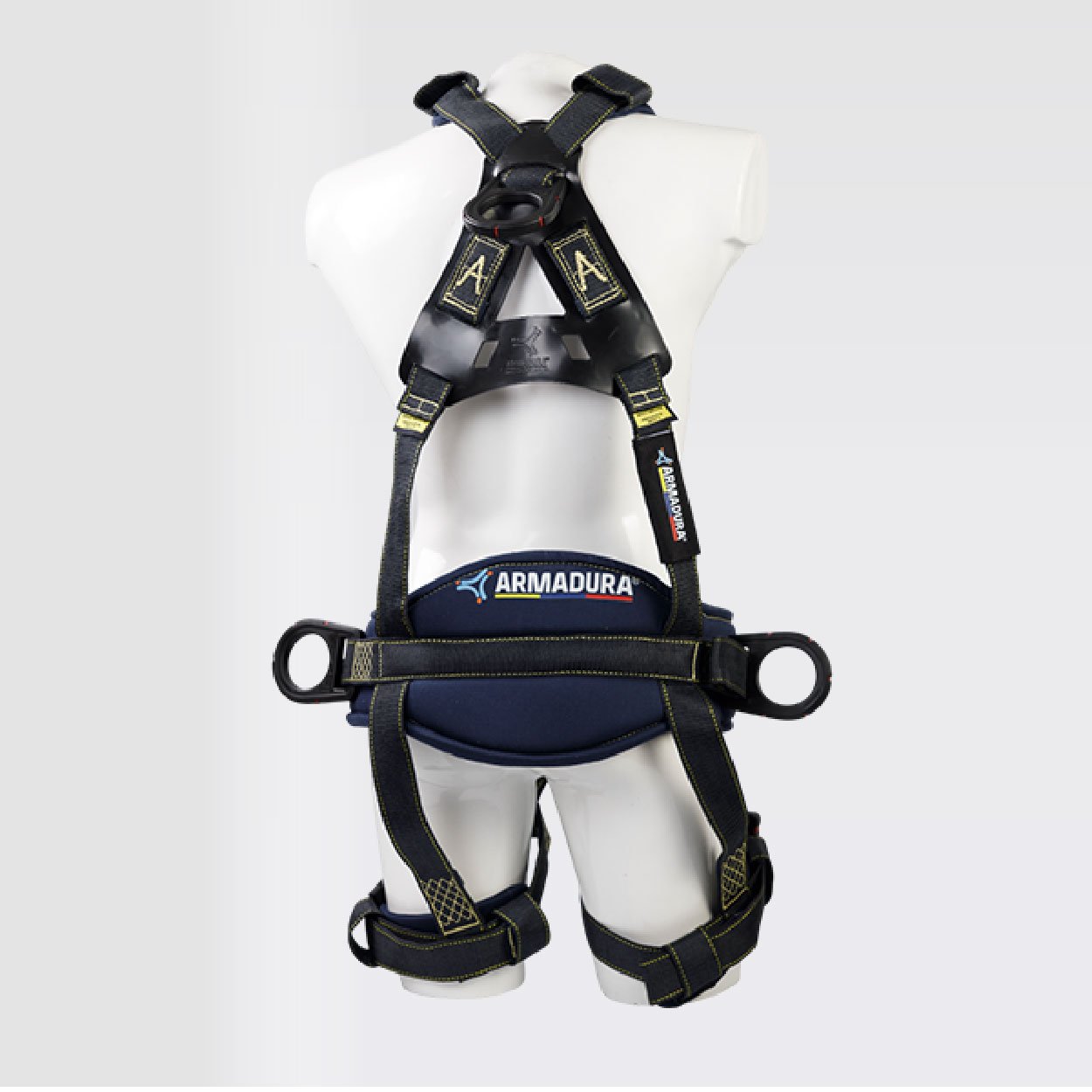 Arnés industrial de cuerpo completo, parte de un sistema Personal de detención de caídas, con diseño en ̈Y ̈, certificado bajo la Norma ANSI/ASSP Z359.11:2021, Talla única, con soporte lumbar para mayor confort, provisto de 2 argollas en reata y 3 argollas con resistencia dieléctrica de 9Kv. equivalente a 9000V, reata ignifuga para protección al calor y las llamas. Cumpliendo con los lineamientos de la ASTM F887:23 (40 Cal/Cm2)*.