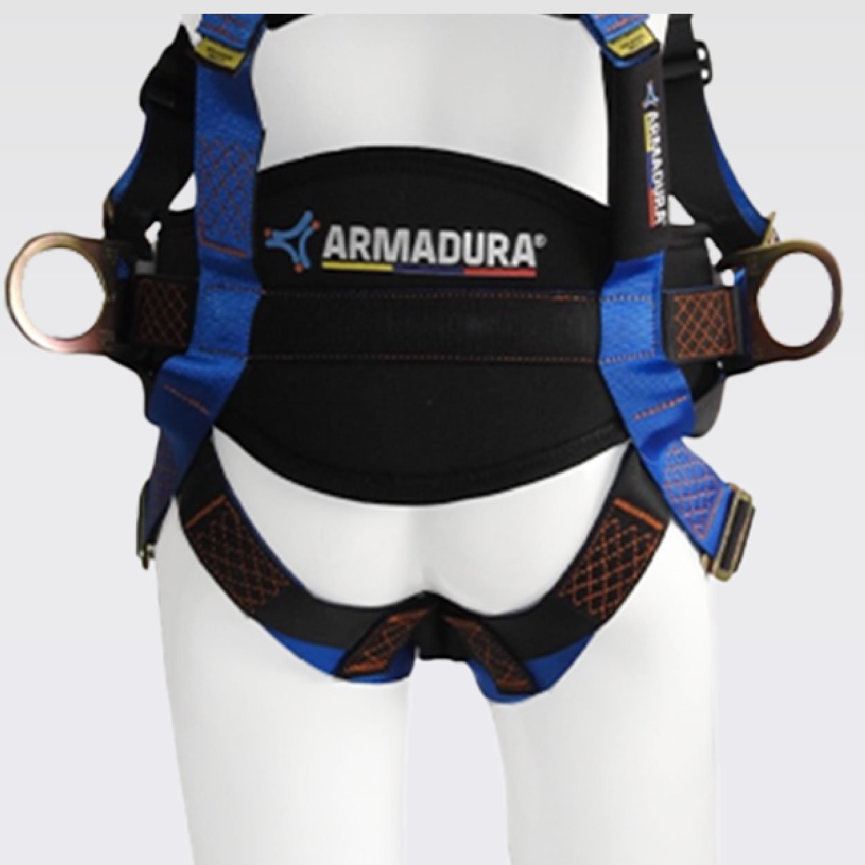 Arnés industrial de cuerpo completo, parte de un sistema personal de detención de caídas, con diseño en H, certificado bajo la Norma ANSI/ASSP Z359 11:2021, Talla única, provisto de 3 argollas en acero, recubrimiento anodizado en el herraje, reata bicolor (azul-negro), resistencia de 5000 libras o 22,2Kn, 5MBS, con soporte lumbar para mayor confort.