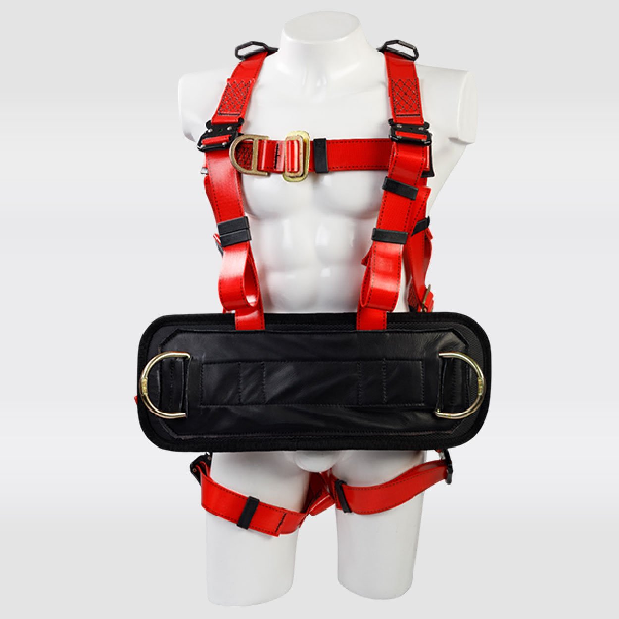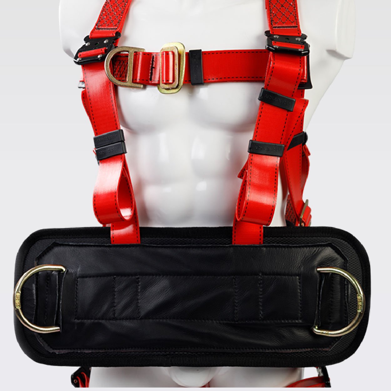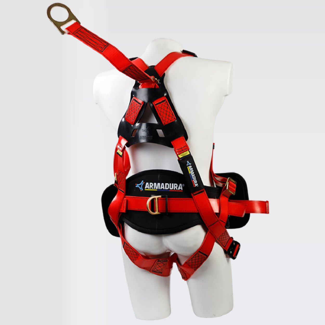 Arnés industrial para encuellador*, cuerpo completo, parte de un sistema Personal de detención de caídas, con diseño en ̈H ̈, Certificado bajo la Norma ANSI/ASSP Z359.11:2021, Talla única, provisto de 5 argollas en acero con recubrimiento anodizado en el herraje con extensión de la argolla dorsal, cuenta con soporte lumbar y soporte ventral, reata con capa en poliuretano de color rojo, resistencia de