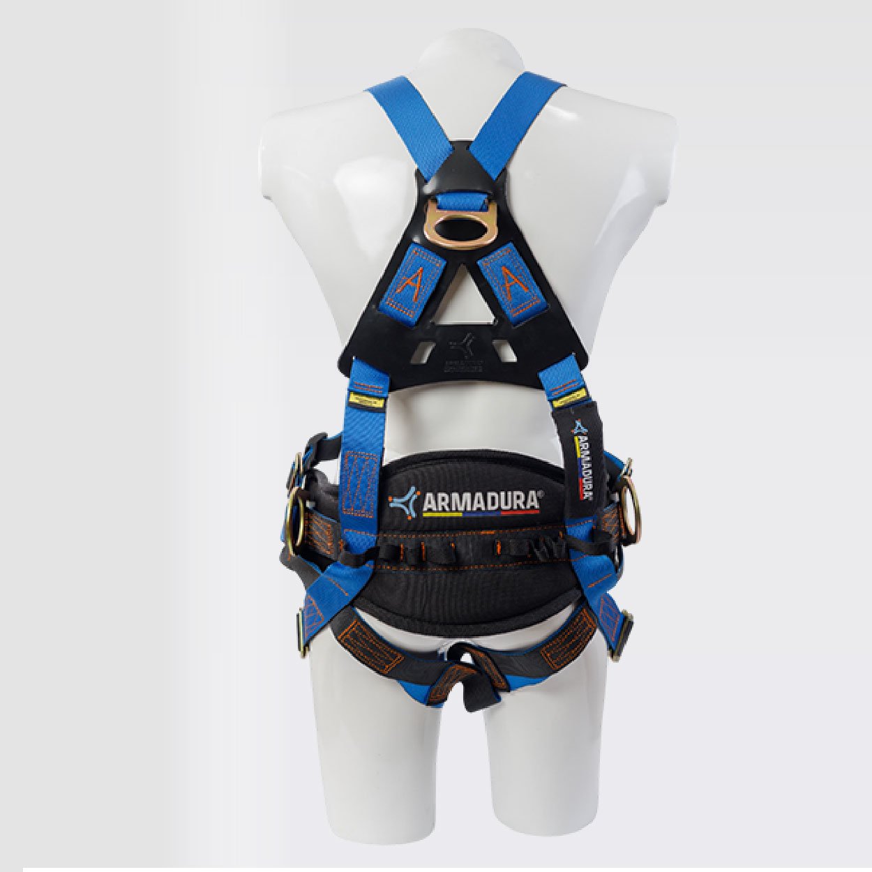 Arnés Certificado bajo la Norma ANSI/ASSP. Z359.11-2021, Talla única, con portaherramientas y faja lumbar para mayor confort, provisto de 4 argollas en acero con recubrimiento anodizado en el herraje, reata bicolor (azul–negra), resistencia de 5000 libras O 22,2Kn, 5MBS