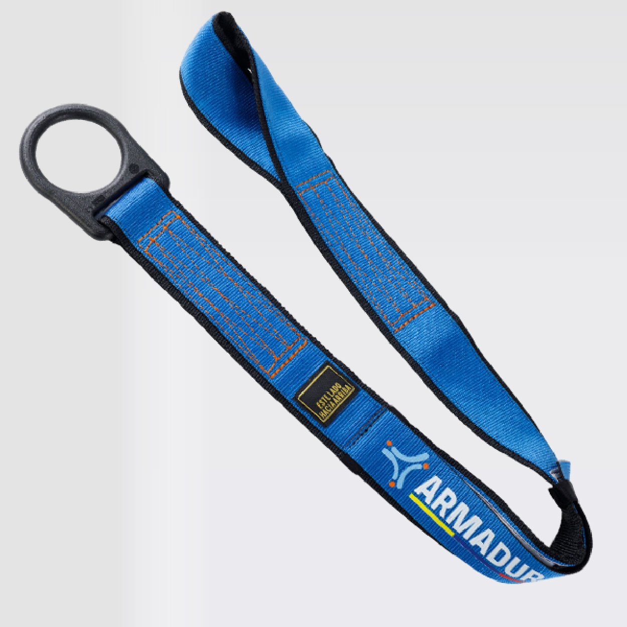 Adaptador de anclaje portátil, parte de un sistema personal de detención y protección de caídas, certificado bajo las normas ANSI/ASSE Z359.18:2017 y cumpliendo con los lineamientos de la ANSI/ASSE Z359.12:2019. provisto de una argolla en acero recubierta en nylon con resistencia dieléctrica de 4Kv, reata bicolor (azul-negra, resistencia de 5000 libras o 22,2Kn, 5MBS.
