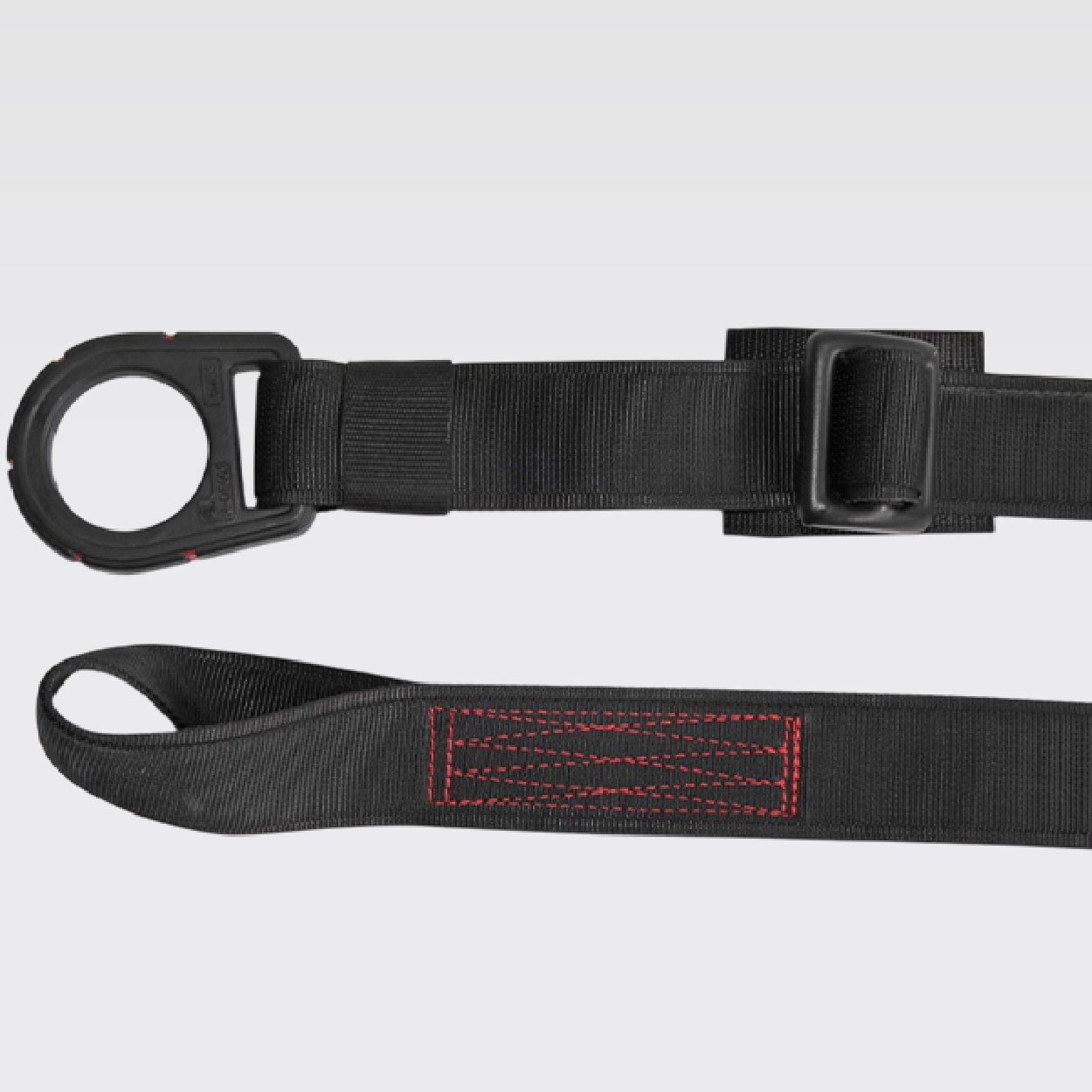 Adaptador de anclaje portátil, parte de un sistema personal de detención y protección de caídas, certificado bajo las normas ANSI/ASSE Z359.18:2017 y cumpliendo con los lineamientos de la ANSI/ASSE Z359.12:2019. provisto de argolla en acero recubiertos con nylon con resistencia dieléctrica de 9Kv. equivalente a 9000V, reata color negra, resistencia de 5000 libras o 22,2Kn, 5MBS.