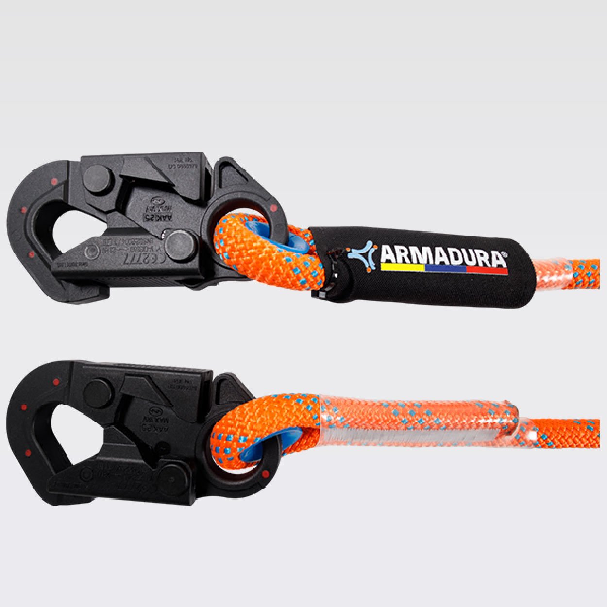 Provisto de dos ganchos de 3⁄4 en acero recubiertos con nylon con resistencia dieléctrica de 9Kv. equivalente a 9000V. resistencia de 5000 libras o 22,2Kn, 5MBS*.