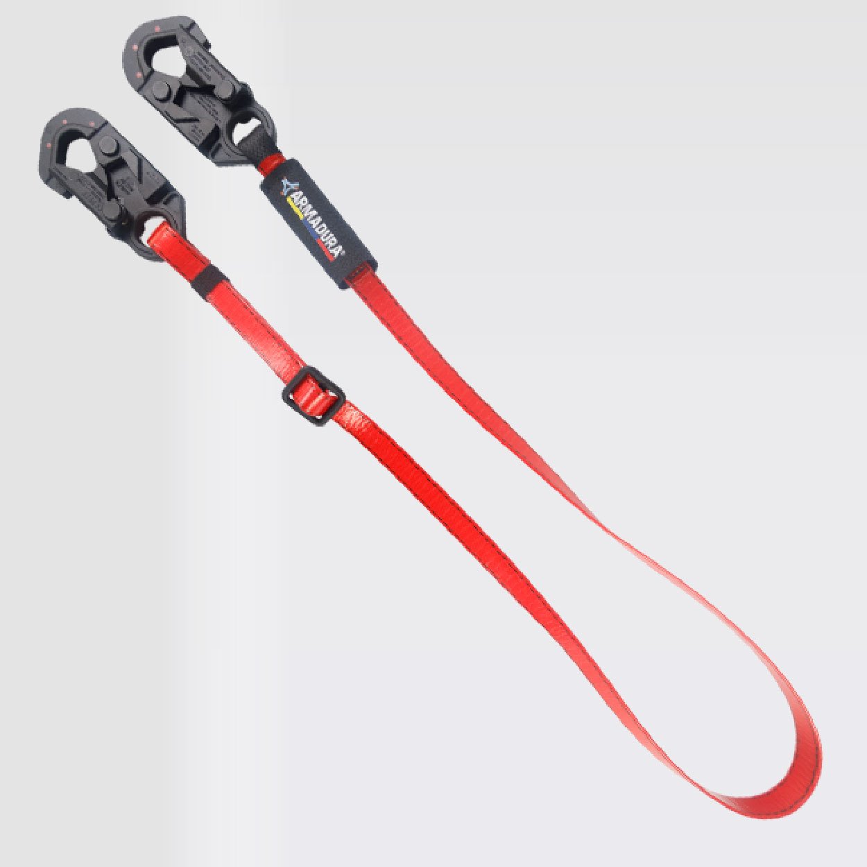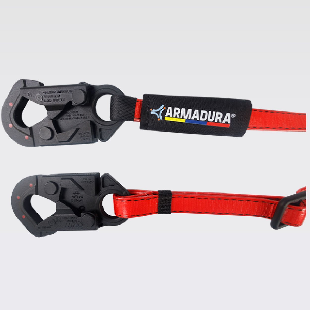 Z359.3:2019, Provisto de dos ganchos de 3⁄4 en acero recubiertos con nylon con resistencia dieléctrica de 9Kv. equivalente a 9000V, reata con capa en poliuretano de color rojo de 25mm. resistencia de 5000 libras o 22,2Kn, 5MBS.