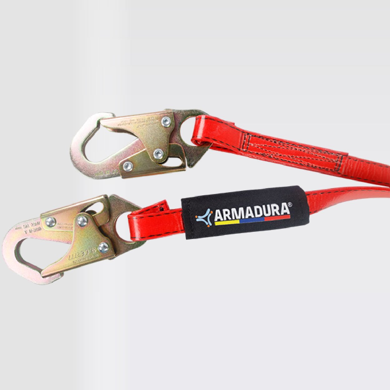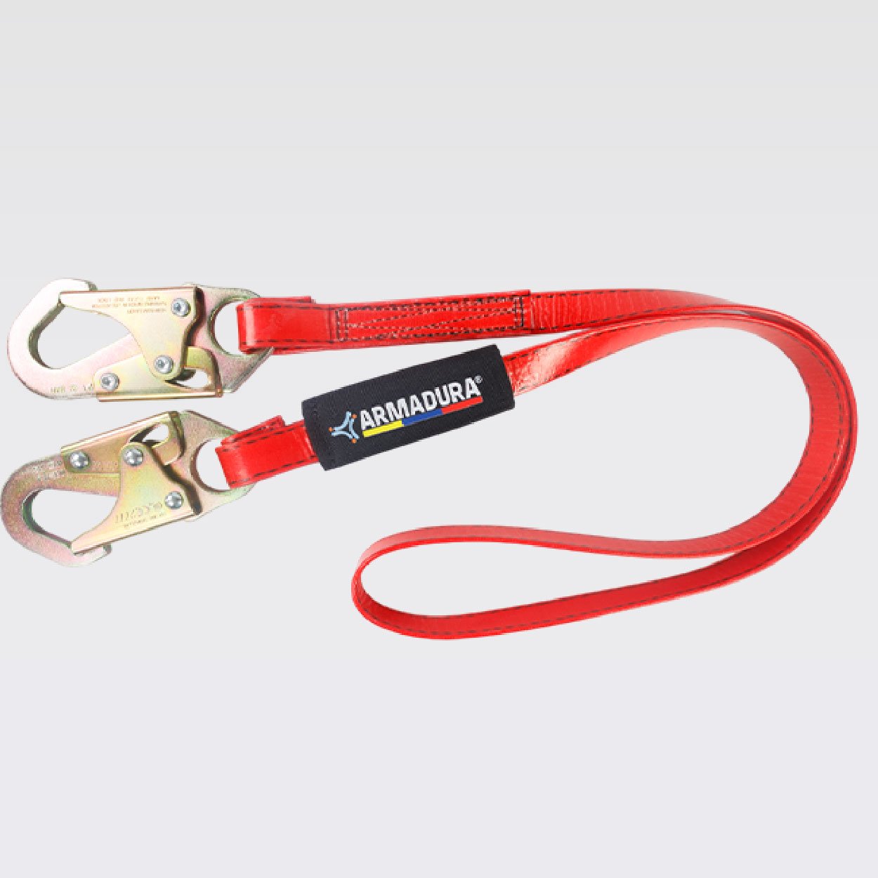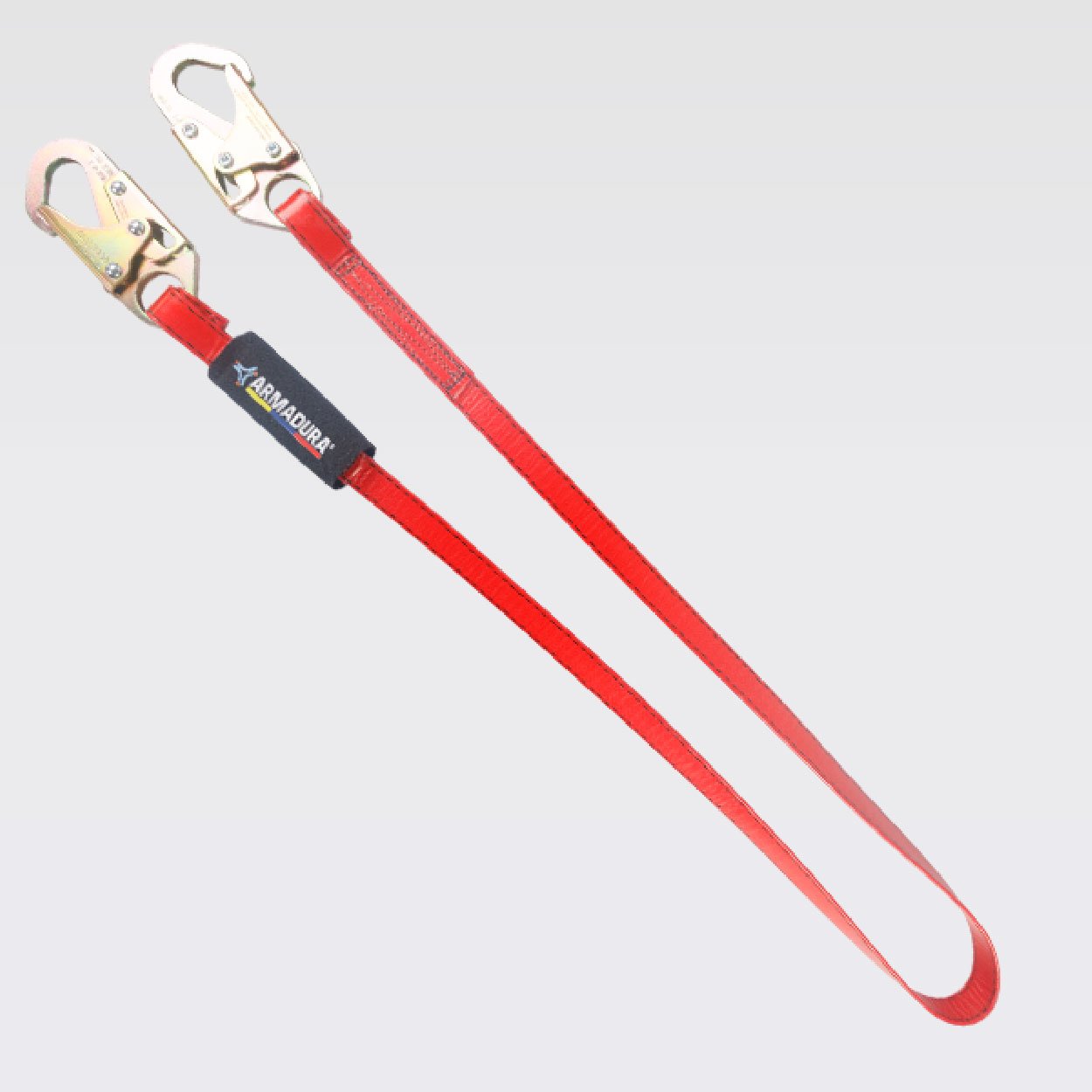 Eslinga sencilla de posicionamiento y restricción de caídas, graduable, parte de un sistema personal, certificada bajo la Norma ANSI/ASSP Z359.3:2019, provisto de dos ganchos de 3⁄4 en acero con recubrimiento anodizado, reata con capa en poliuretano de color rojo de 25mm. resistencia de 5000 libras o 22,2Kn, 5MBS.