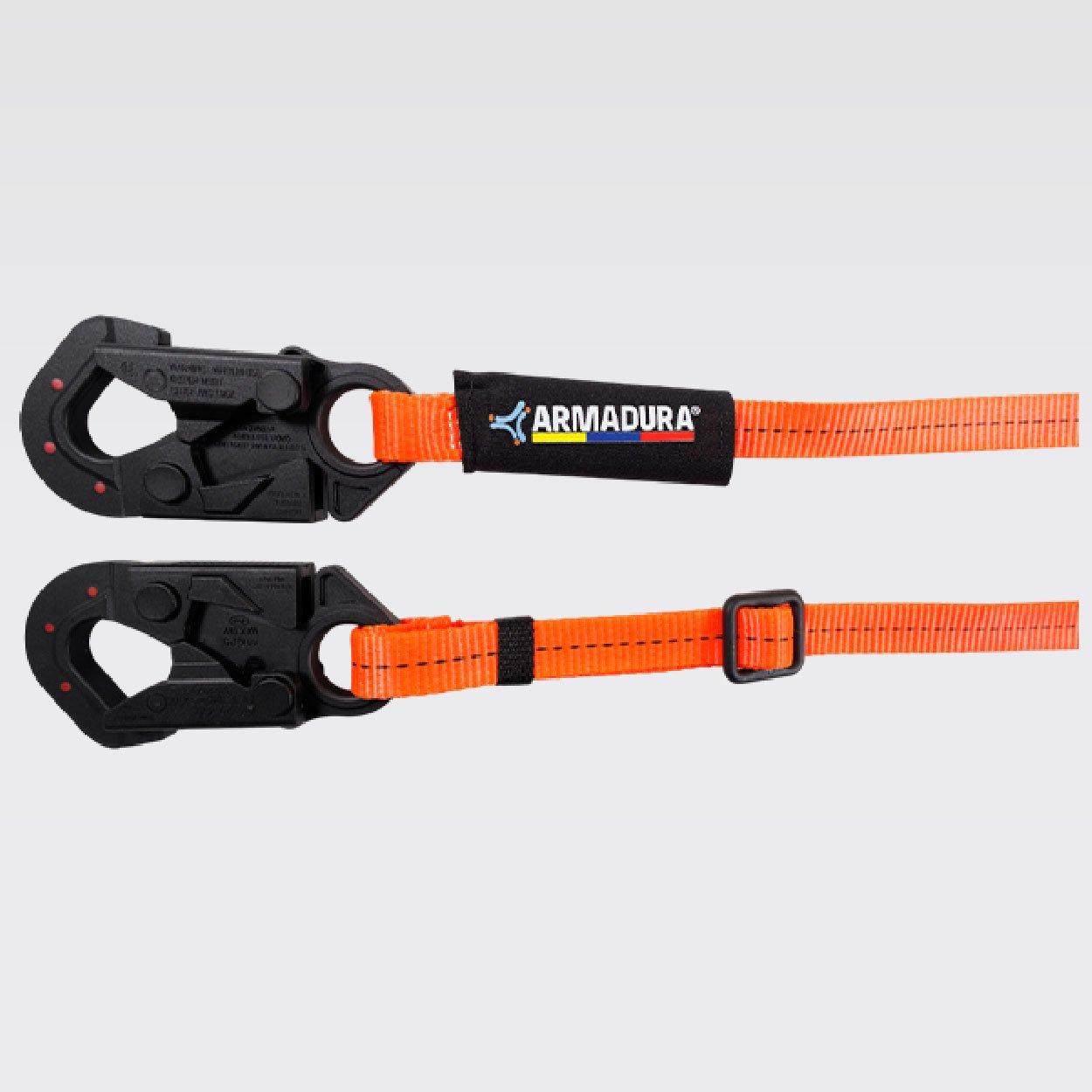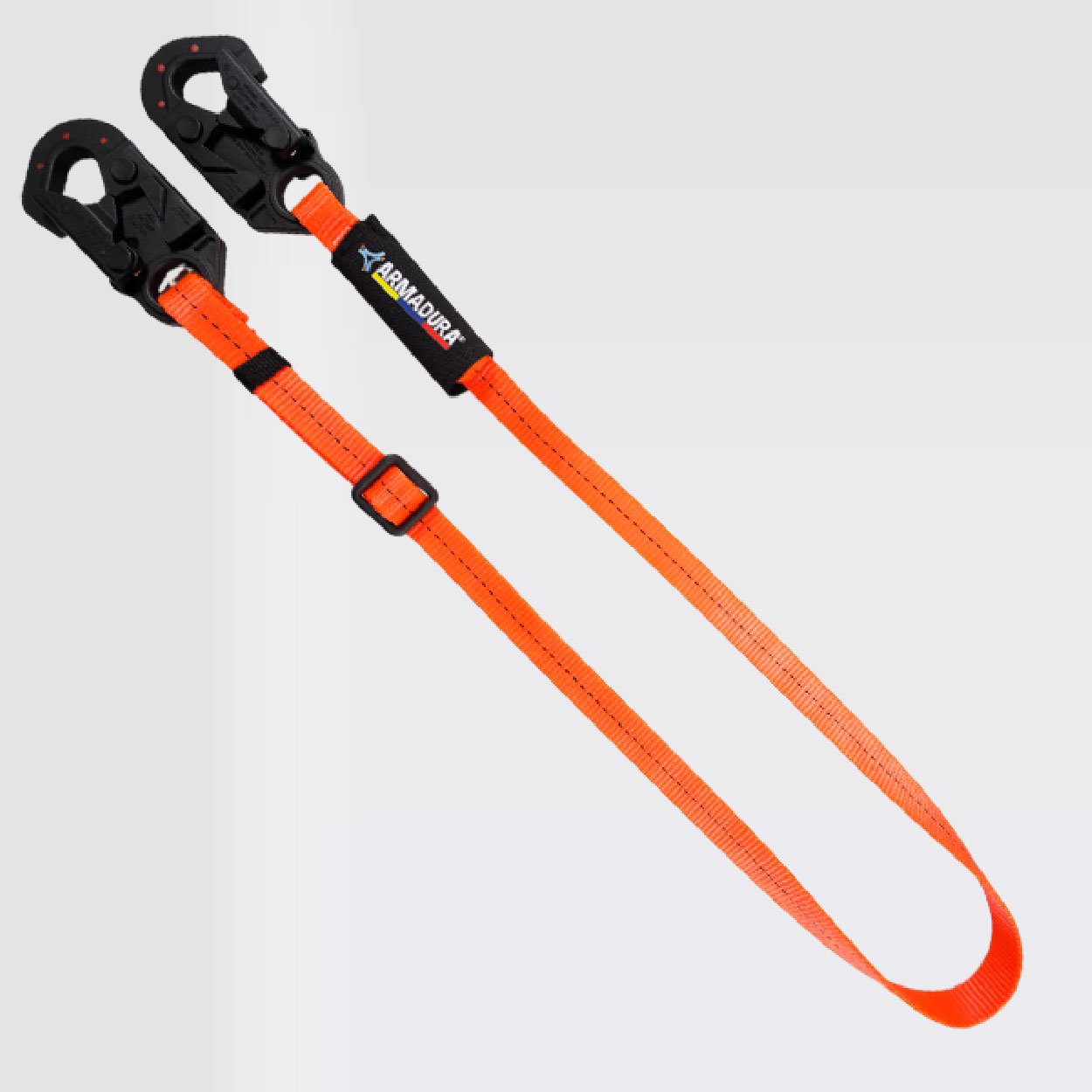 Eslinga sencilla de posicionamiento y restricción de caídas, longitud de 1,80 metros, parte de un sistema personal, certificada bajo la Norma ANSI/ASSP Z359.3:2019, provisto de dos ganchos de 3⁄4 en acero con recubrimiento anodizado, reata color naranja o azul, 25mm de ancho. resistencia de 5000 libras o 22,2Kn, 5MBS.