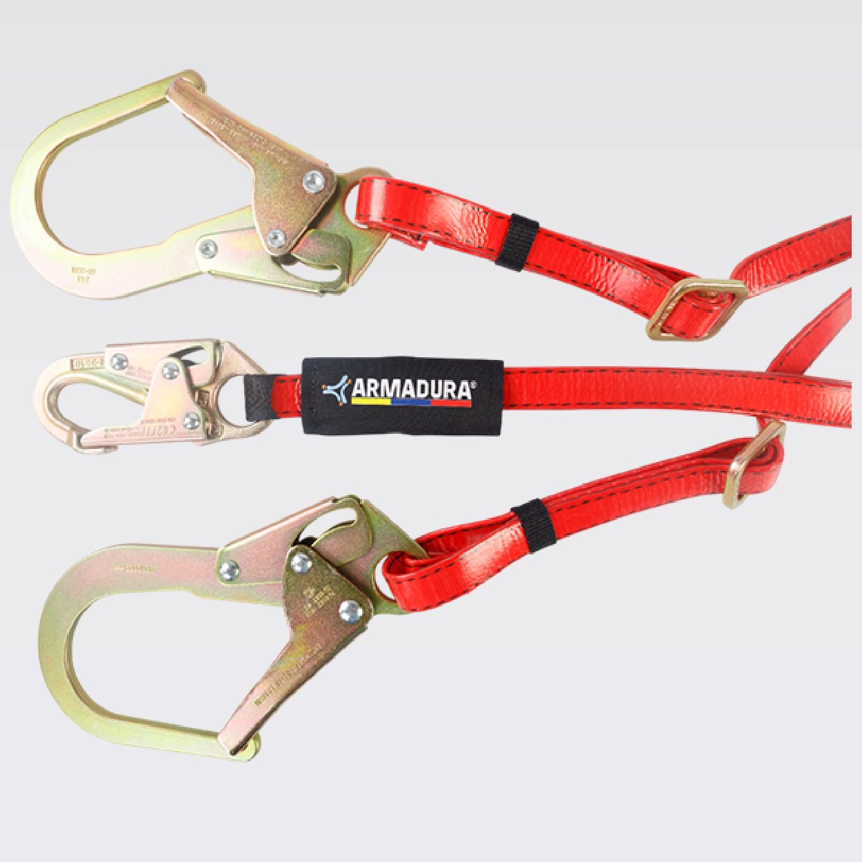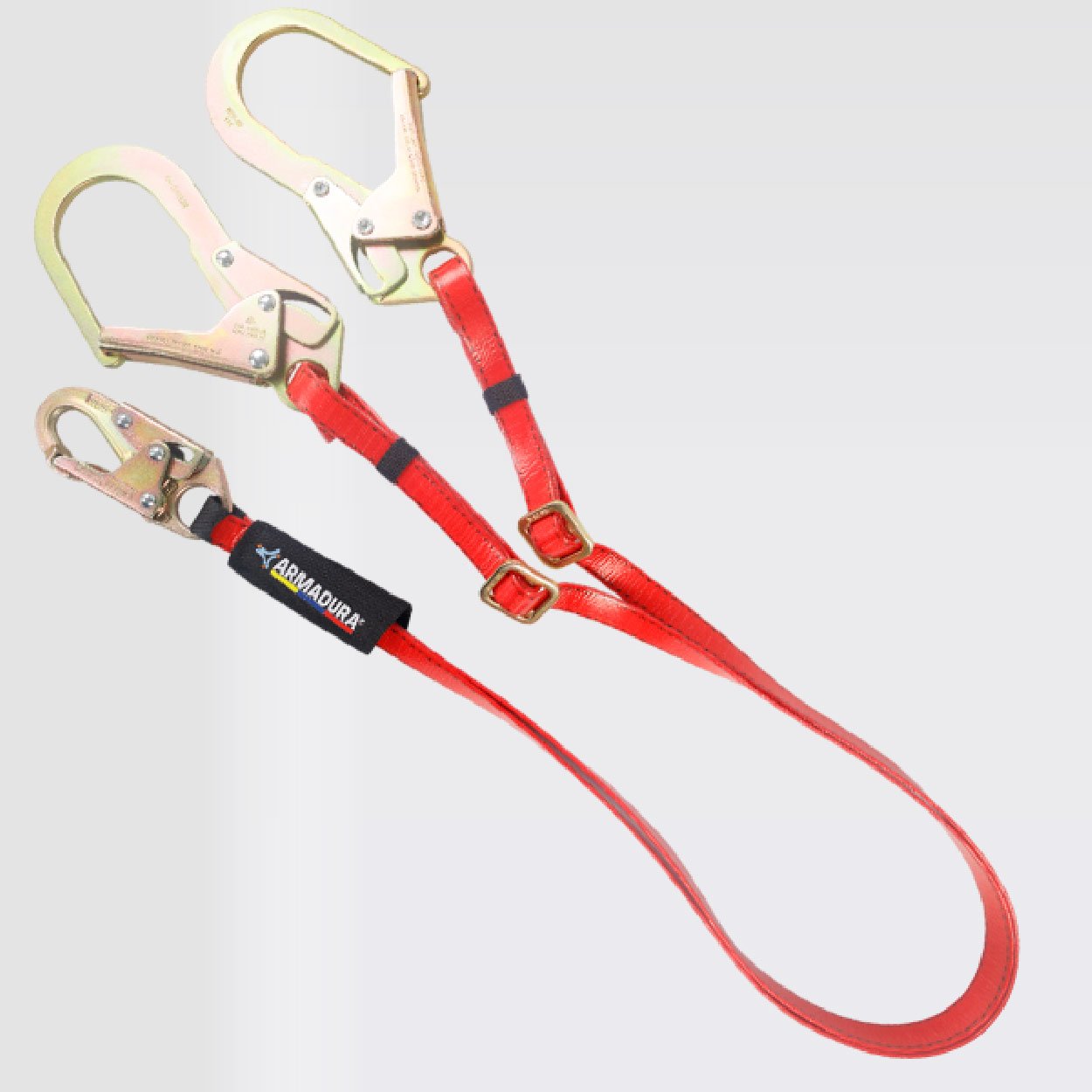 Provisto de un gancho de 3⁄4 y dos ganchos 21⁄4 en acero con recubrimiento anodizado, reata con capa en poliuretano de color rojo de 25mm. Resistencia de 5000 libras o 22,2Kn, 5MBS.