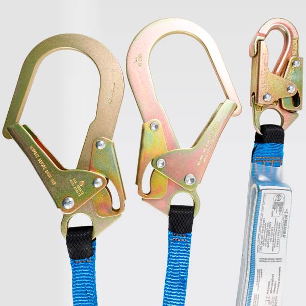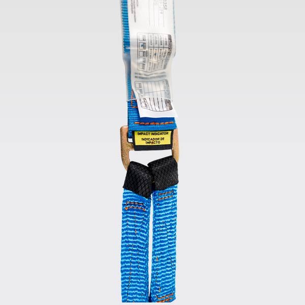 Eslinga certificada bajo la Norma ANSI/ASSP Z359.13-2013, provisto de un gancho de 3⁄4 y dos de 21⁄4 en acero con recubrimiento anodizado, reata bicolor (azul-negro) de 44mm y/o reata en color azul de 25mm. resistencia de 5000 libras o 22,2Kn, 5MBS.