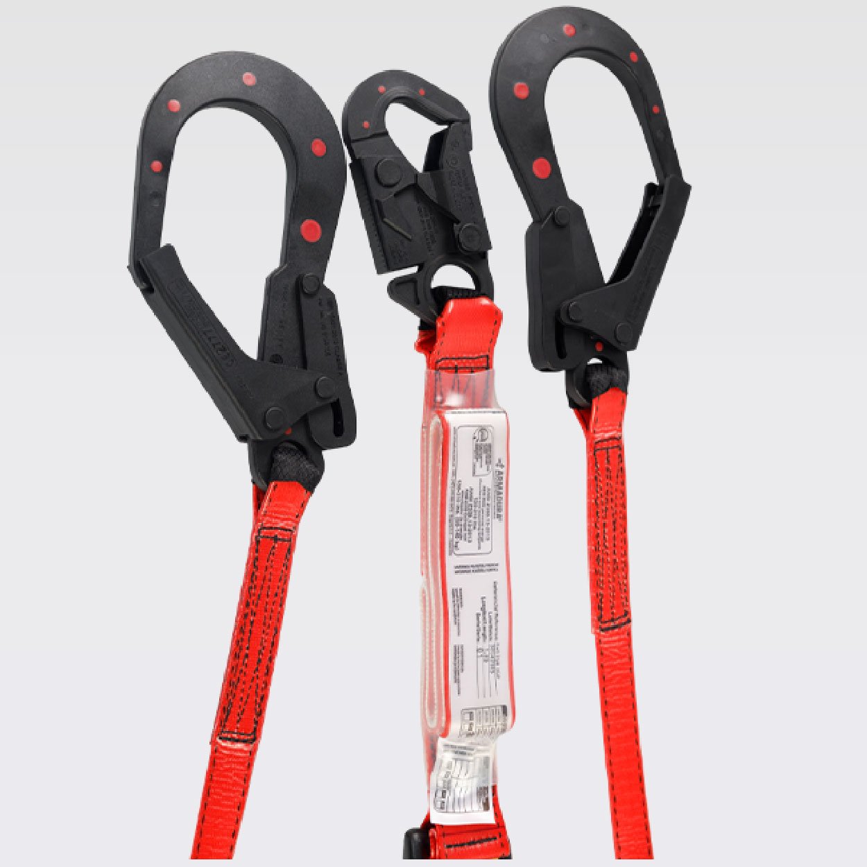 Norma ANSI/ASSE Z359.13:2013, provisto de un gancho de 3⁄4 y dos ganchos de 21⁄4 en acero recubiertos con nylon con resistencia dieléctrica de 9Kv. equivalente