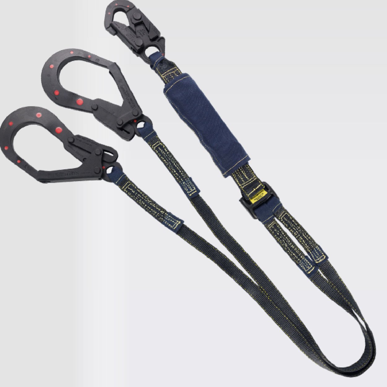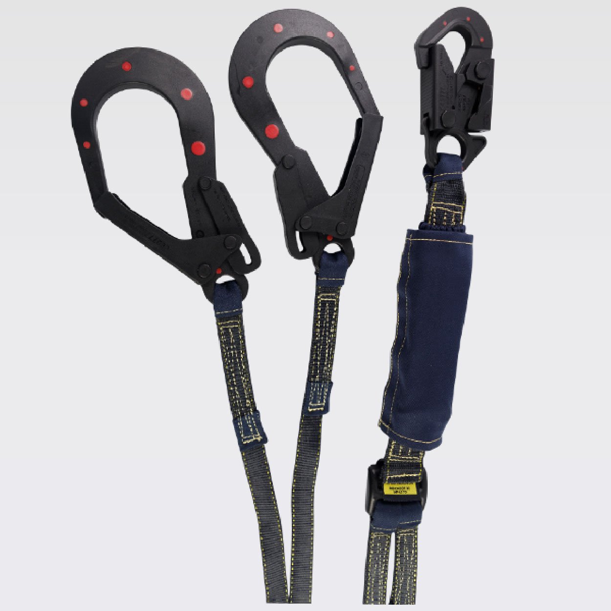 ANSI/ASSE Z359.13:2013, provisto de un gancho de 3⁄4 y dos ganchos de 21⁄4 en acero recubiertos con nylon con resistencia dieléctrica de 9Kv. equivalente a