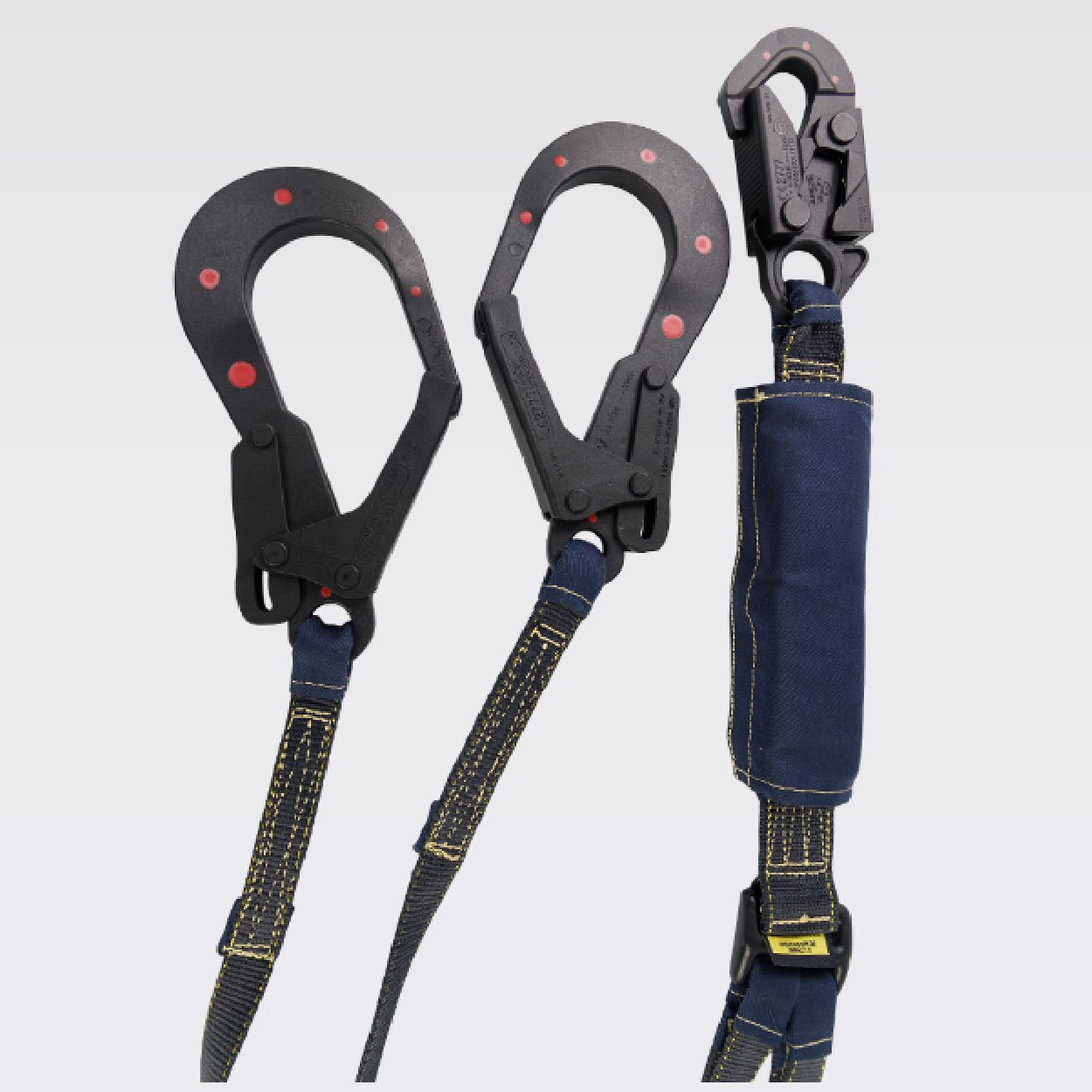 Norma ANSI/ASSE Z359.13:2013, provisto de un gancho de 3⁄4 y dos ganchos de 21⁄4 en acero recubiertos con nylon con resistencia dieléctrica de 9Kv. equivalente a 9000V, reata ignifuga de 44mm y/o 25mm, para protección al calor y las llamas. Cumpliendo con los lineamientos de la ASTM F887:23 (40 Cal/Cm2)*, Resistencia de 5000 libras o 22,2Kn, 5MBS.