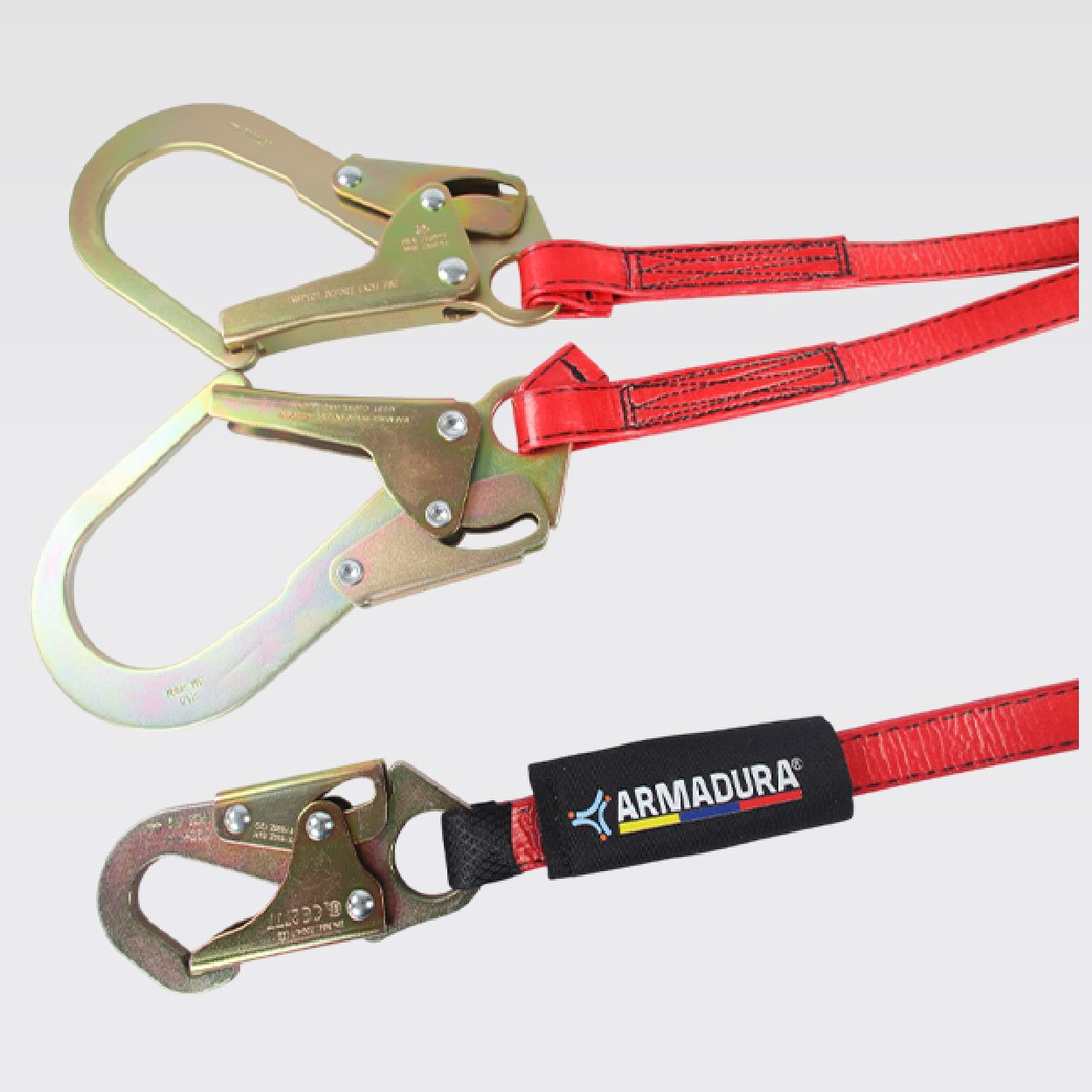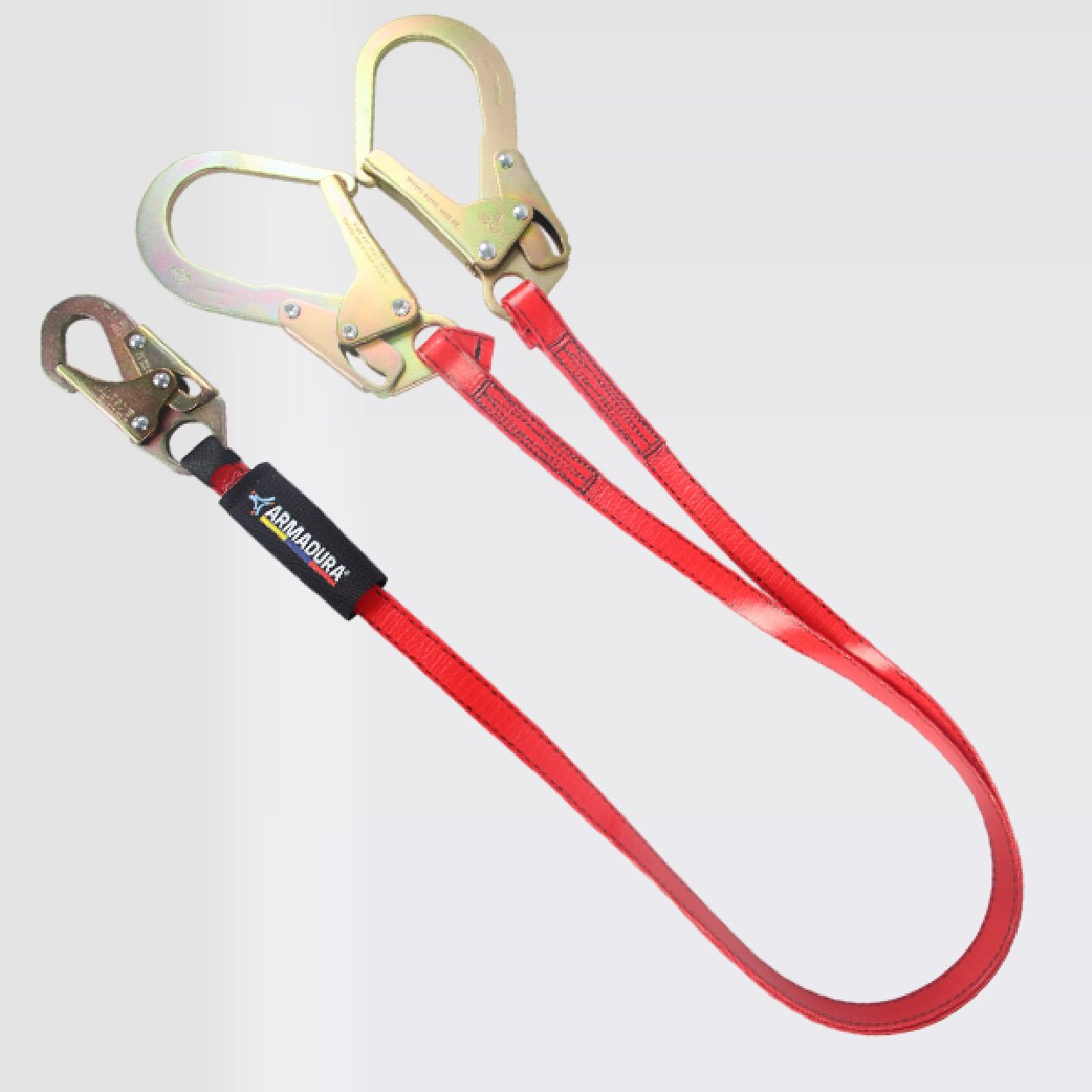 Eslinga de posicionamiento y restricción de caídas, doble terminal, parte de un sistema personal, certificada bajo la Norma ANSI/ASSP Z359.3:2019, Provisto de un gancho de 3⁄4 y dos ganchos 21⁄4 en acero con recubrimiento anodizado, reata con capa en poliuretano de color rojo de 25mm. Resistencia de 5000 libras o 22,2Kn, 5MBS.