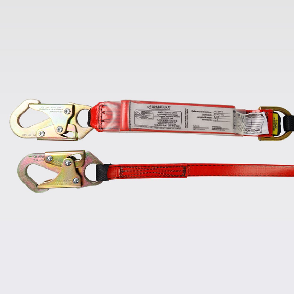 Z359.13:2013, provisto de dos ganchos de 3⁄4 en acero con recubrimiento anodizado, reata con capa en poliuretano de color rojo de 44mm y/o 25mm. Resistencia de 5000 libras o 22,2Kn, 5MBS.