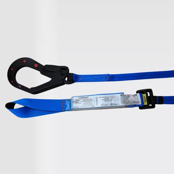 Eslinga de protección, sencilla con absorbedor de energía, parte de un sistema Personal de detención de caídas, certificada bajo la Norma ANSI/ASSE Z359.13:2013, provisto de bucle (argolla en reata) y un gancho de 21⁄4 en acero, recubiertos con nylon y resistencia dieléctrica de 9Kv. equivalente a 9000V, reata azul de 44mm y/o 25mm de ancho. resistencia de 5000 libras o 22,2Kn, 5MBS.