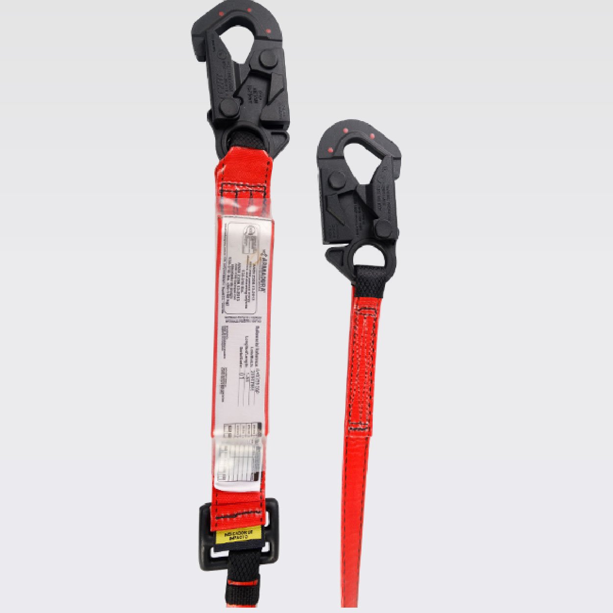 Z359.13:2013, provisto de dos ganchos de 3⁄4 en acero recubiertos con nylon con resistencia dieléctrica de 9Kv. equivalente a 9000V, reata con capa en poliuretano de color rojo de 44mm y/o 25mm. Resistencia de 5000 libras o 22,2Kn, 5MBS.