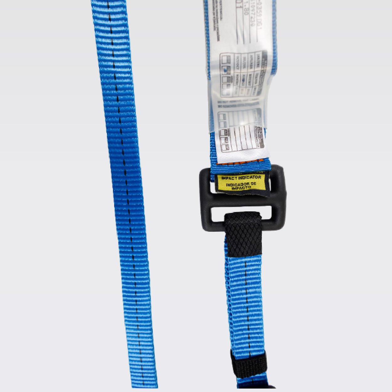 Eslinga de protección, dieléctrica, sencilla graduable, con absorbedor de energía, parte de un sistema Personal de detención de caídas, certificada bajo la Norma ANSI/ASSE Z359.13:2013, provisto dos ganchos de 3⁄4 en acero recubiertos con nylon con resistencia dieléctrica de 9Kv. equivalente a 9000V, reata bicolor (azul-