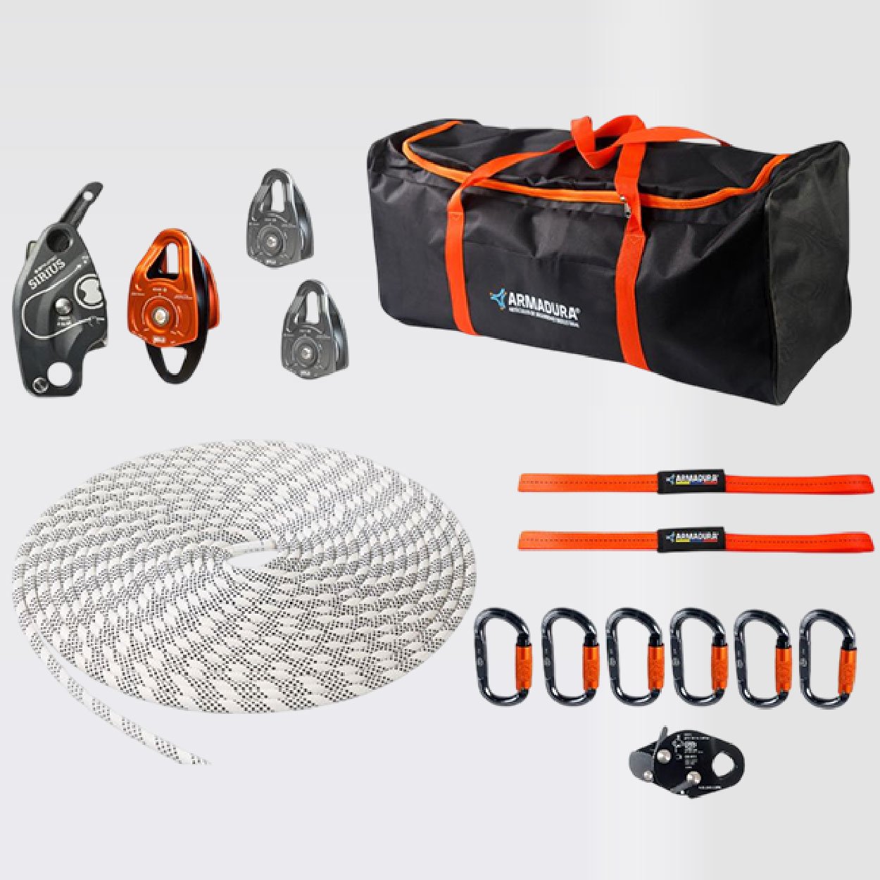 Este kit de rescate está diseñado para trabajos en altura, rescate, y tareas en espacios confinados. Se compone de una serie de herramientas de alta resistencia que permiten un control preciso y seguro en situaciones de emergencia y operaciones de trabajo exigentes. Los componentes están fabricados con materiales duraderos y cumplen con las normativas de seguridad más rigurosas.